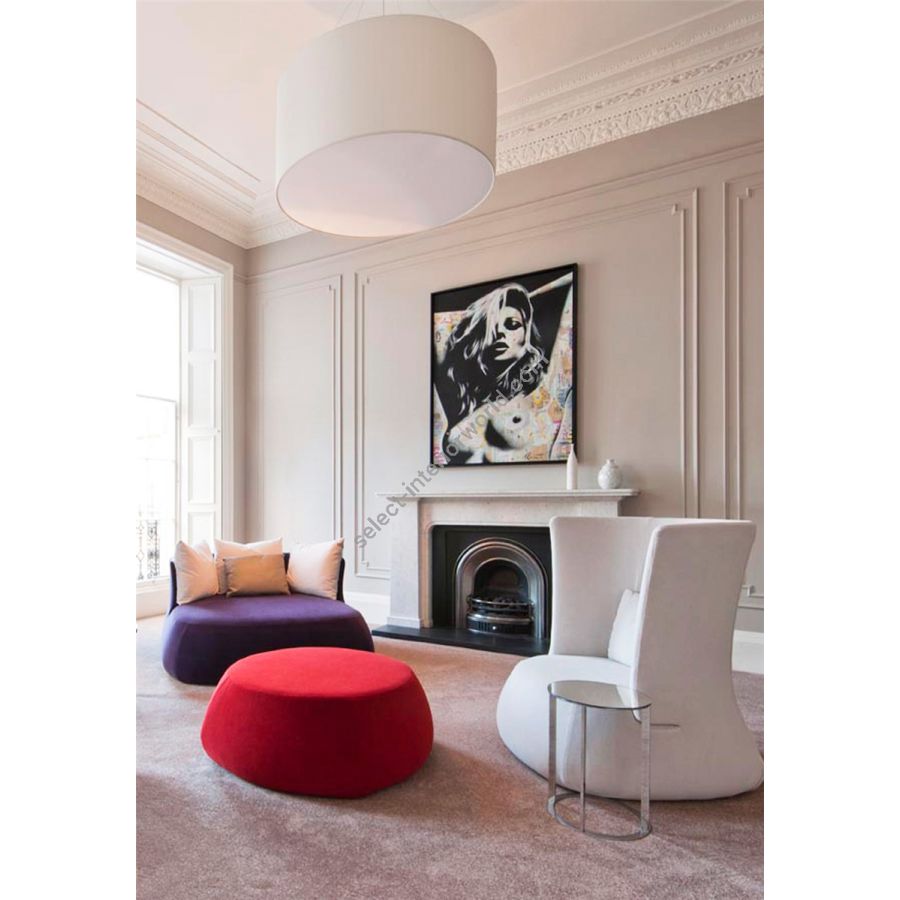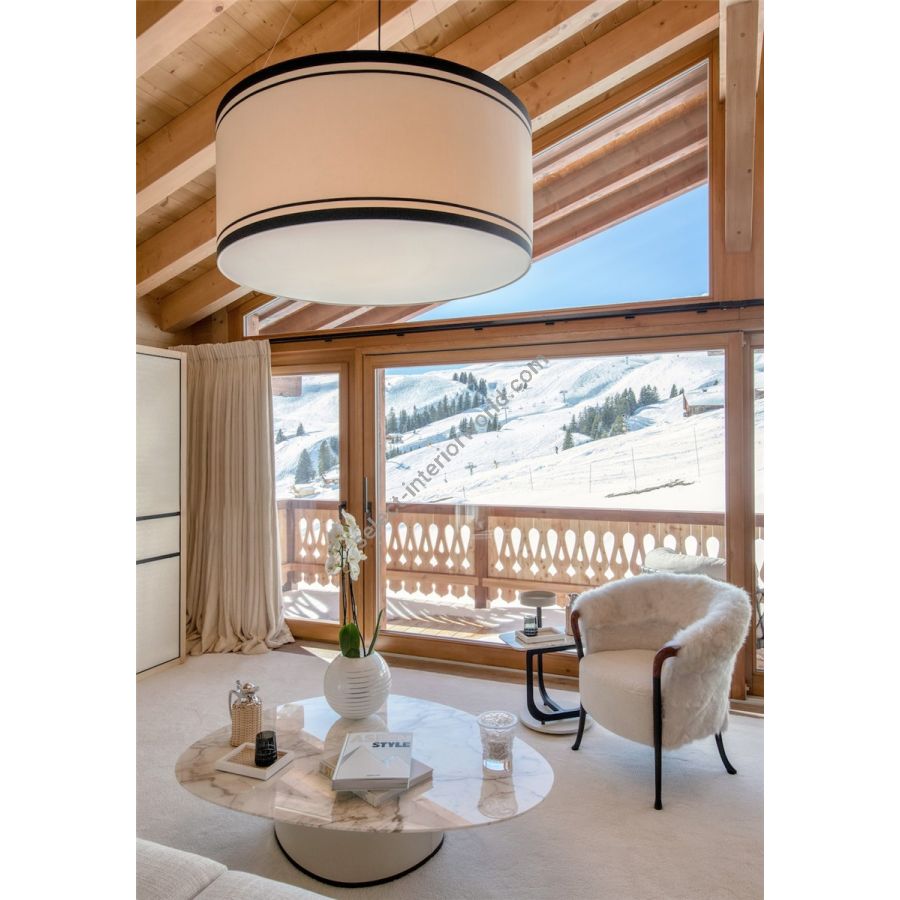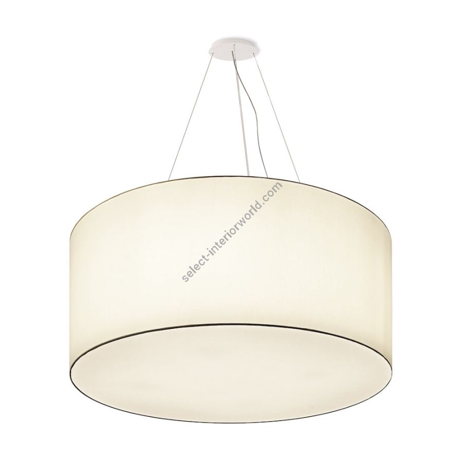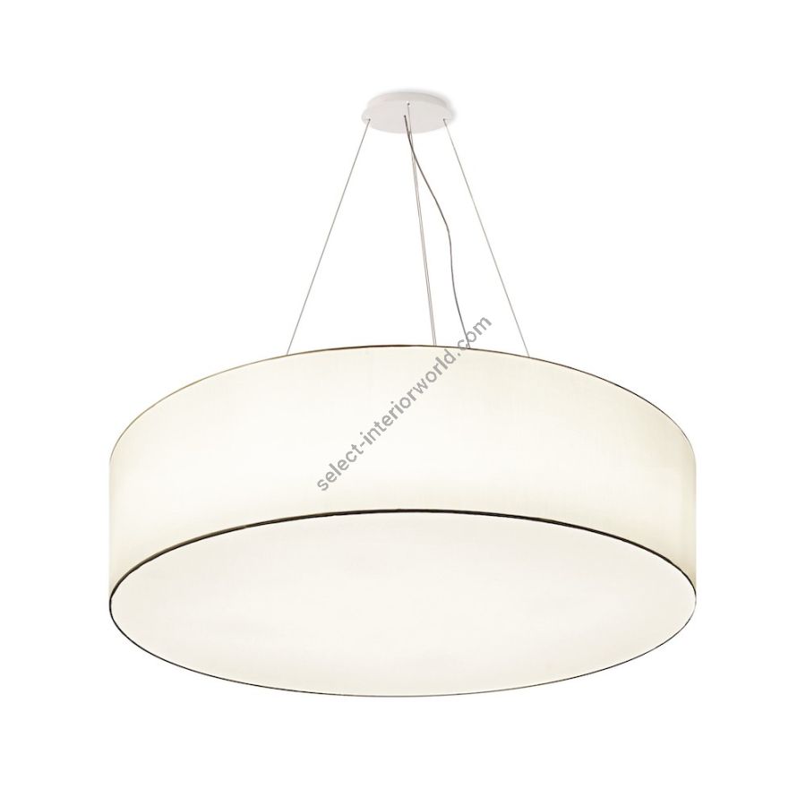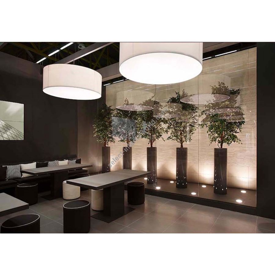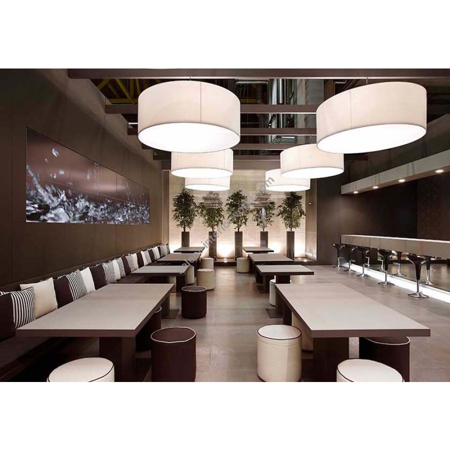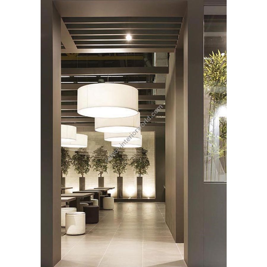 A simple but complete product that allows you to customise the fabric lampshade with trimmings of different colours. All sizes are available with two different light sources: the version with E27 bulbs mounted vertically on the support beams to ensure uniform illumination without the formation of shadows and the version with customized LED plate, very compact, designed for use in commercial spaces, such as offices and retail shops. The latter offers the possibility - unlike the traditional version - to significantly reduce the height of the lampshade.