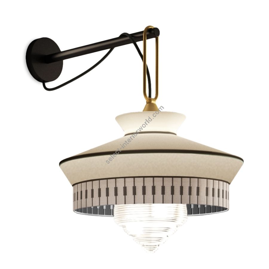 The wall lamp version is characterised by a thin and elegant arm with a matt silk black lacquered finish. It also has a satin brass ring that supports the lamp.