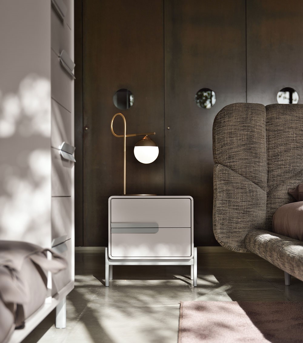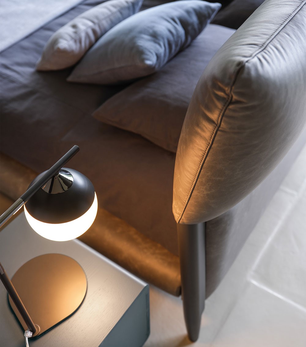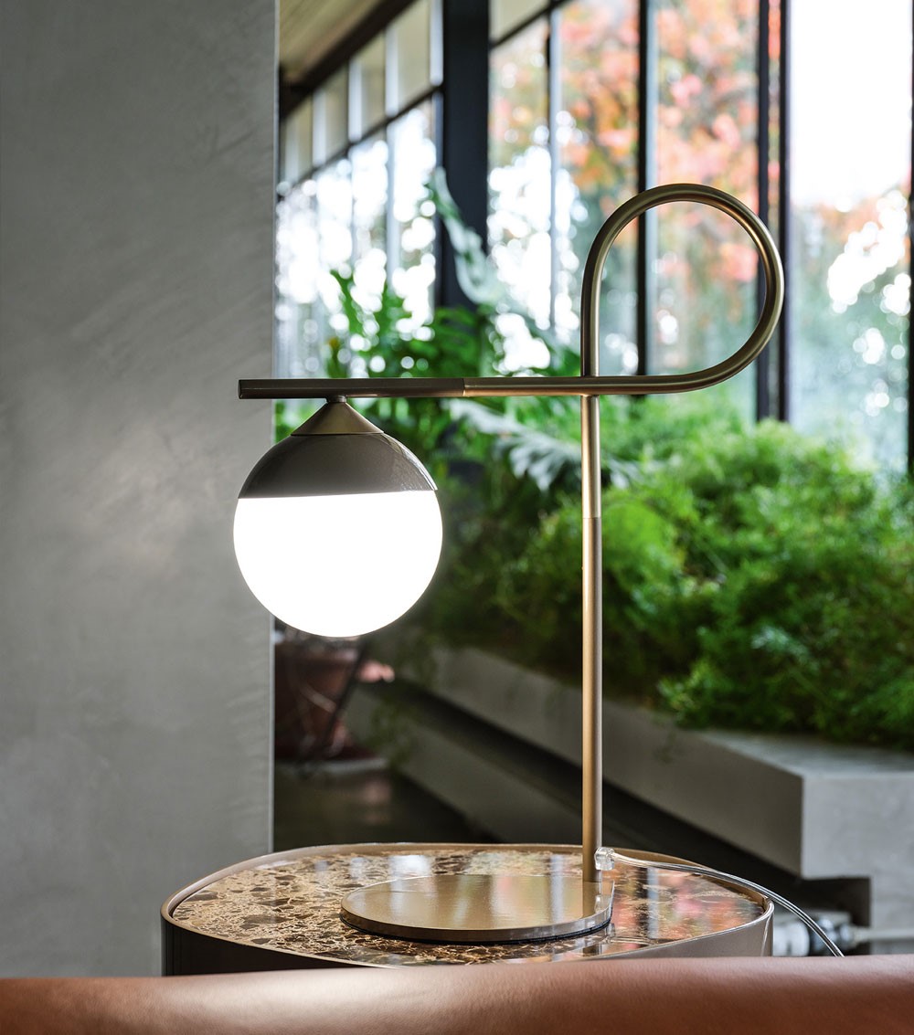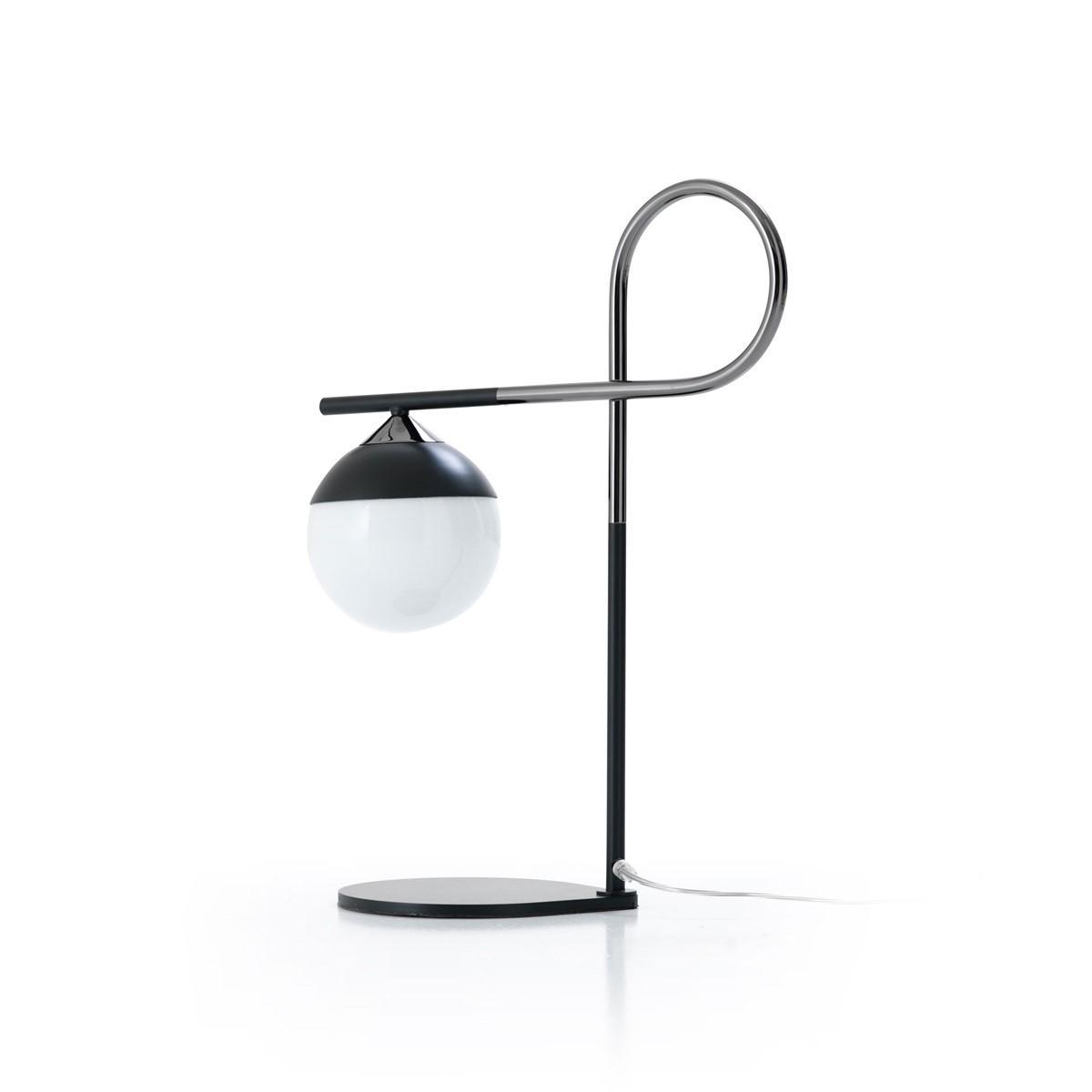 Simple and essential design represented by the metal structure, slender and fine embellished with a knot at its end. The light source is a milk-colored blown glass sphere. The two-tone metal structure, one part chromed and the other painted, is an expression of elegance and luxury. Its simple and clean shapes make it a modern object suitable for all types of environments.