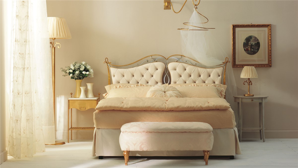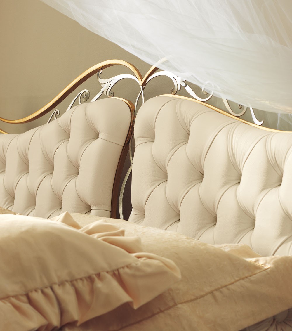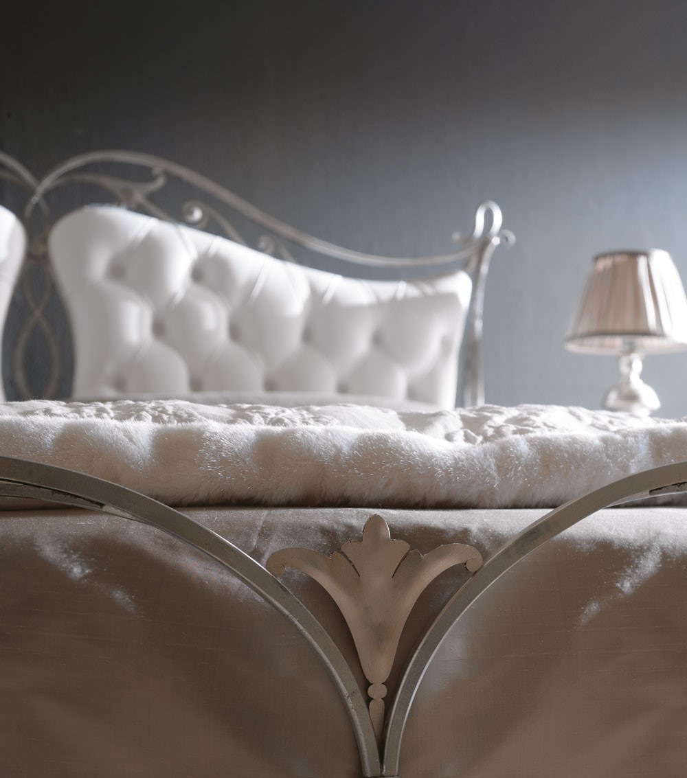 Classic bed made of forged iron, with matching footboard and iron bed frame. Romantic leaves and floral decorations intertwine to remember peaceful moments. A classicism that does not tire and remains unchanged over time. Also available without footboard, with padded bed frame, for a fresher and lighter version.