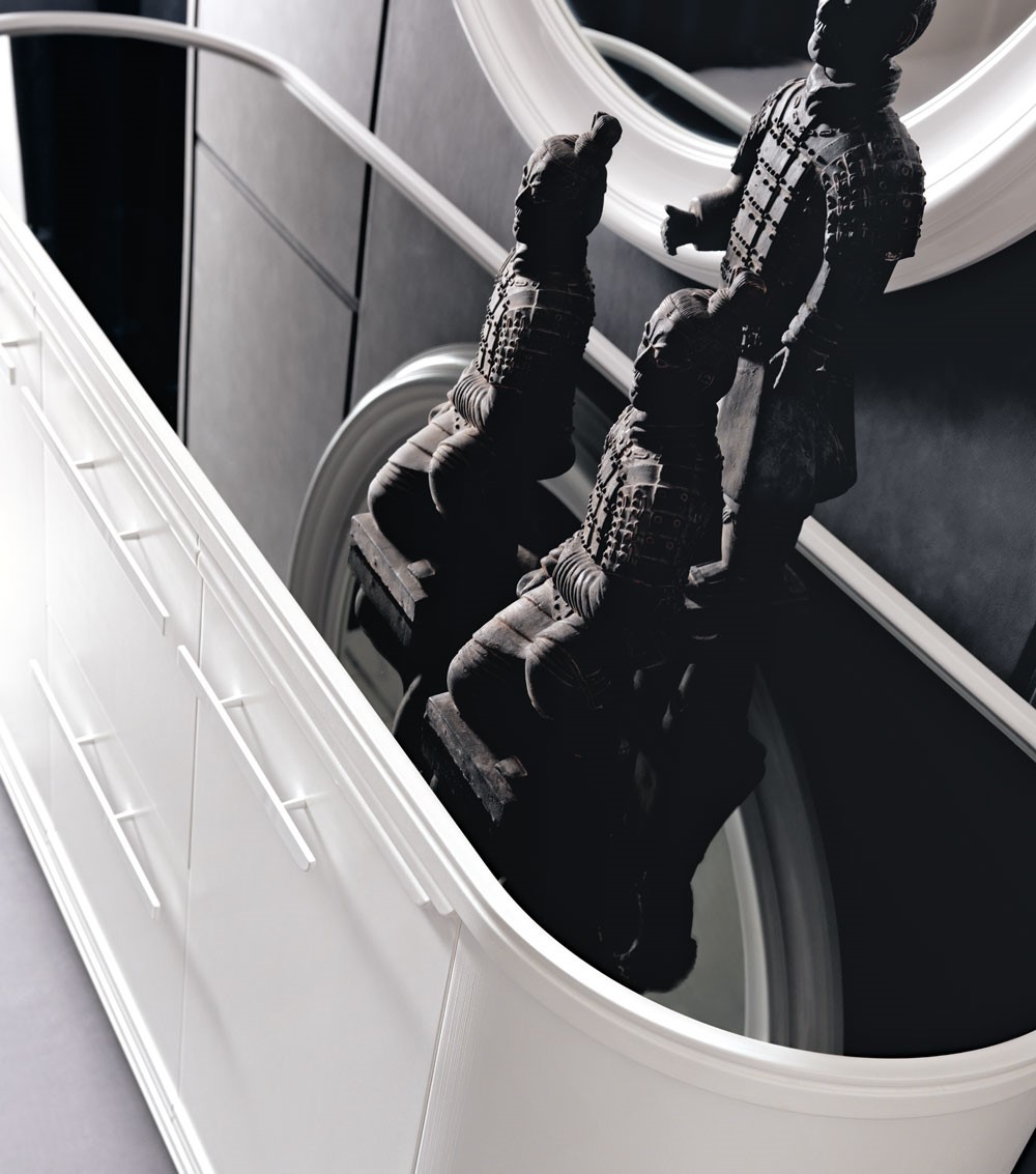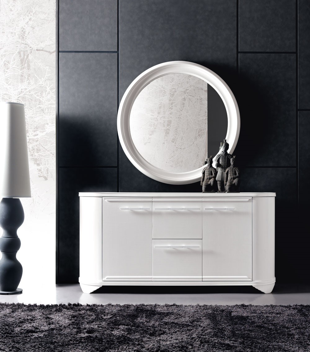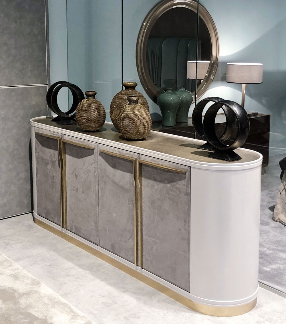 | Sideboard Materials Blockboard structure of MDF plated poplar. Mdf top with recessed mirror or marble sheet, eco-letaher or leather covered doors. Curved poplar plywood sides veneered in mdf. Iron hand polished handles and base. |