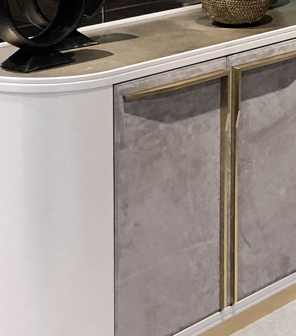 An elegant and clean sideboard with simple but uncommon shapes. The combination of precious materials, the slender line of the metal handles and plinth, together with the wisely handcrafted leather covered doors, make the perfect mix for obtaining a classy, stylish, refined sideboard.