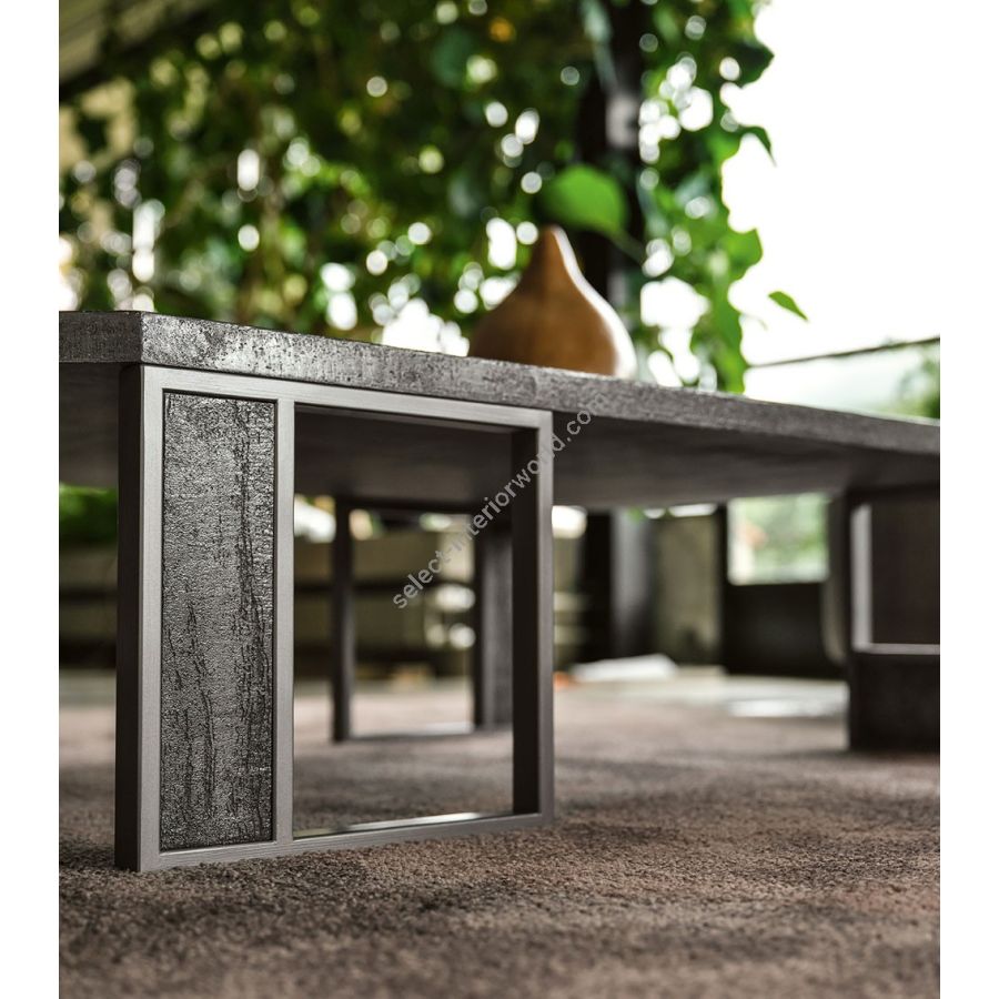 Coffee table with wooden top and iron legs. The geometric lines of the top are completed with those of the legs that host precious decorative details in wood, stoneware or glass. The top and the inserts are also available in the precious ROCK finish, available in Grey, Bronze and Silver versions.