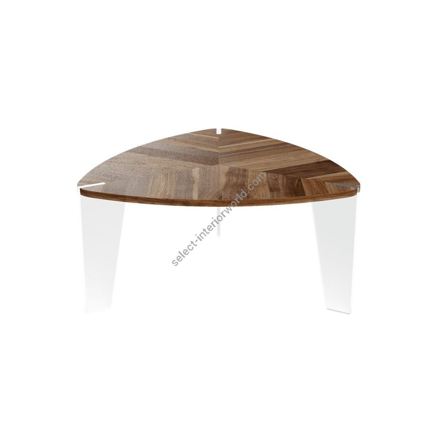 Illusion combines with the substance of traditional solid wood processing. The Sospeso solid wood coffee table is created by the expert hands and vision of our artisans. The linear and formal design of the wooden top worked with inlay technique rests on legs in extra-clear glass with visible joints to convey a floating effect.