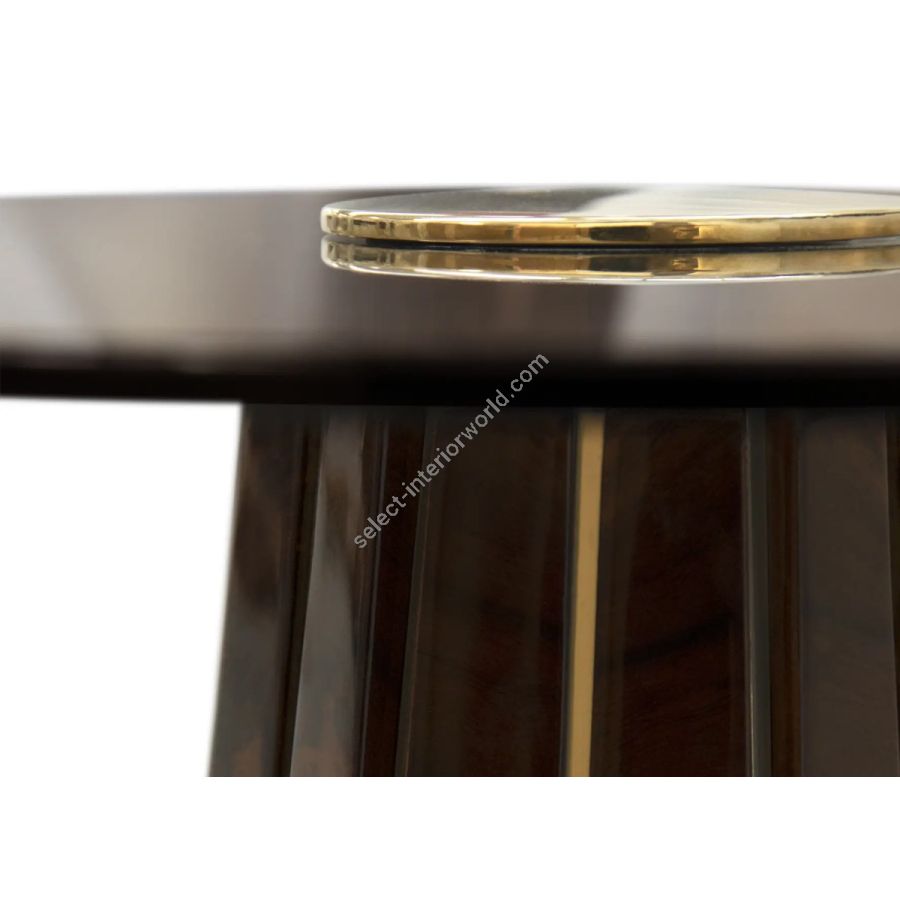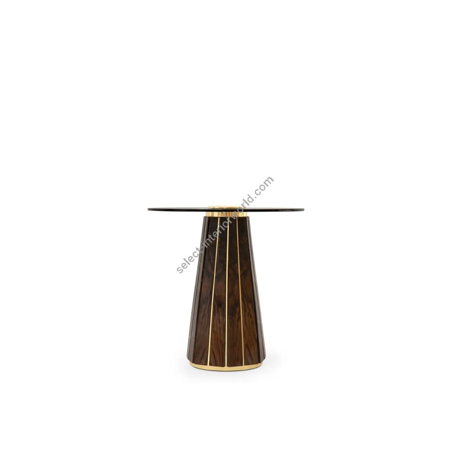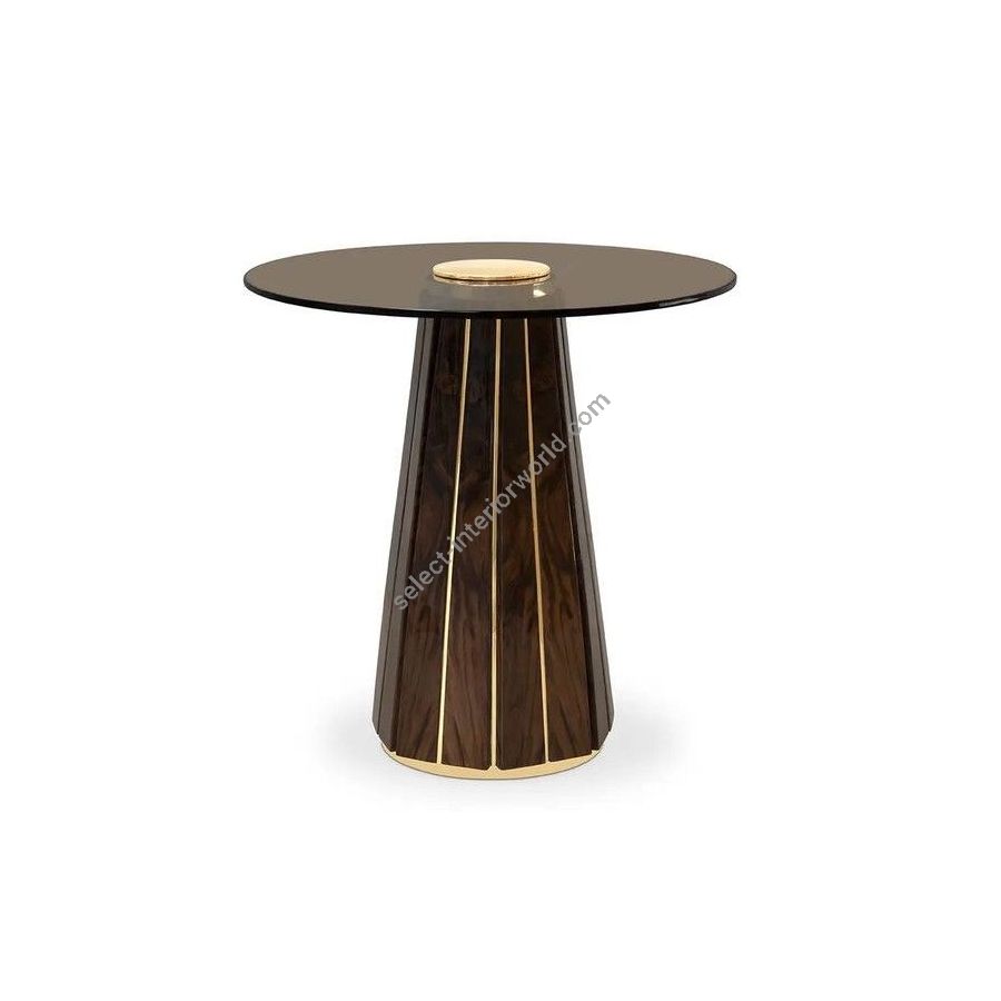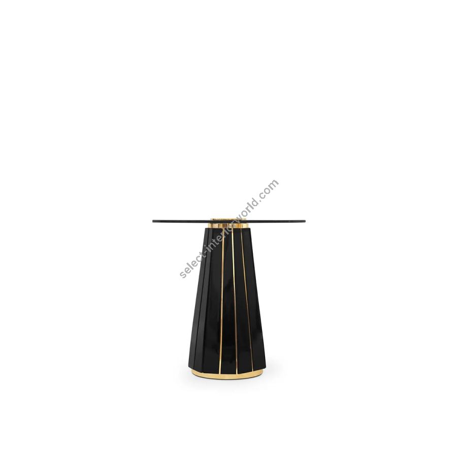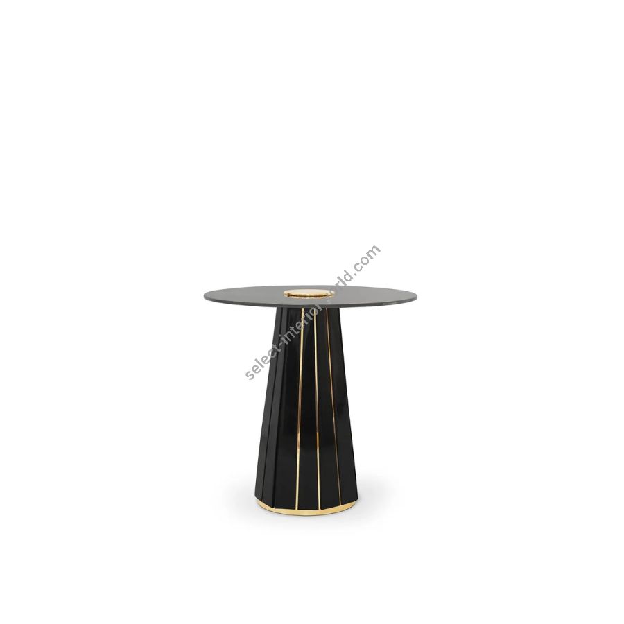 Inspired by the remarkable Darian sideboard, the Darian Side Table II exudes luxury and grandeur. With its impressive design, this modern side table features a handcrafted wooden structure in black lacquer, adorned with polished brass bars. The round smoked glass top adds a touch of sophistication to this ravishing piece. A piece that effortlessly adapts to any ambiance or style, making it a perfect choice for elevating any interior decor.