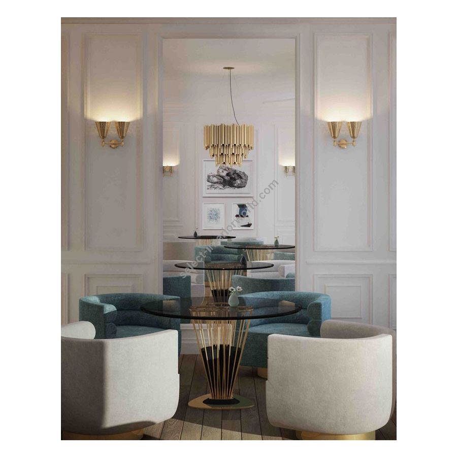 Brubeck mid-century modern chandelier is inspired by one of the foremost exponents of cool jazz: Dave Brubeck. This unique lighting design represents the sophistication and finesse of the American jazz pianist, displaying a very luxurious feeling. DelightFULL’s skilled artisans handmade this round chandelier in brass, covering it with a gold-plated finish, which can be customized in multiple other finishes. The result of this outstanding creation is a functional dining room chandelier with sculptural shapes.