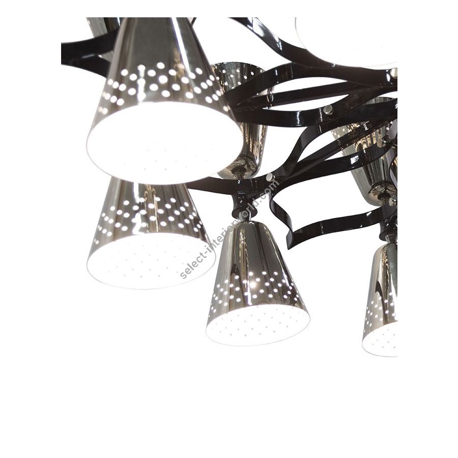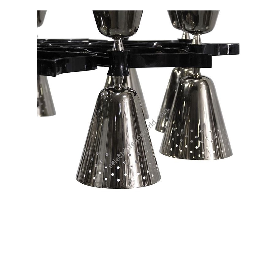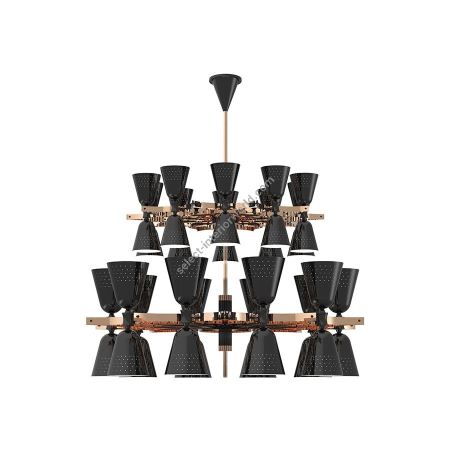 A revival of the mid-century modern design classics, Charles contemporary chandelier is a simple lighting design with a lot of character. It features 20 lampshades, all of them handmade in brass, with perforated details on the top. A copper plated finish is applied to the body of the lamp at the end of the process, creating a more contemporary vibe. The shades are lacquered a glossy black on the outside and a matte white on the inside, helping to create a more cozy light to the human eye. This copper pendant lighting can also be customized to have more shades, according to your needs. The right contemporary pendant light for a Scandinavian dining room, or a modern living room design.