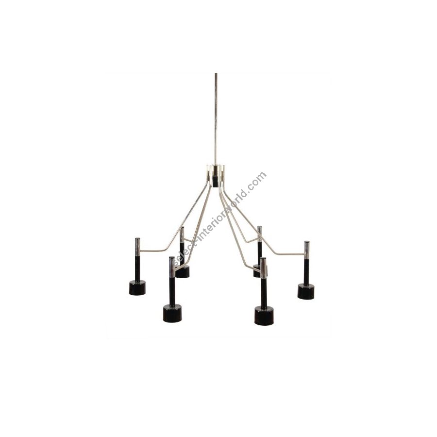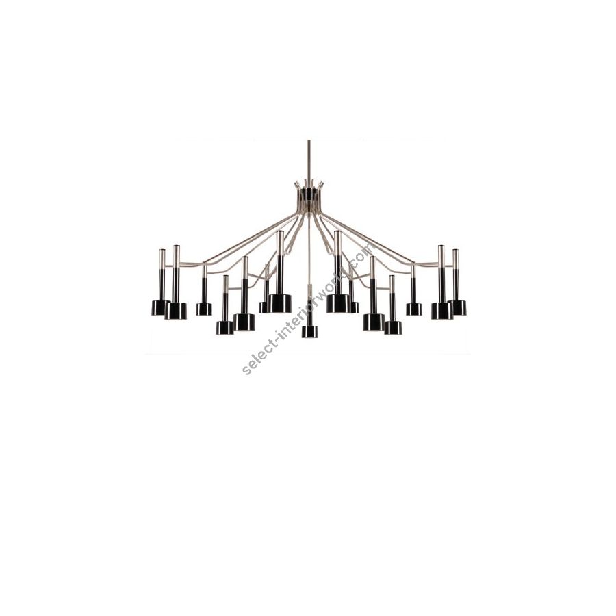 Ella round chandelier is a unique ceiling fixture which brings back the clean and sophisticated feelings of the mid-century modern era lived in the 1960’s Palm Springs. With a body 100% handmade in brass and its lampshades made of aluminum, this lighting design was reinvented using today’s technical skills paired with the traditional craftsmanship and know-how of some of the best portuguese artisans. The body has a nickel plated finish, while the lampshades are lacquered a glossy black for a sleeker look. It is available both in the 6 or 15 arms versions. An iconic mid-century modern chandelier, perfect for a contemporary living room or dining area.