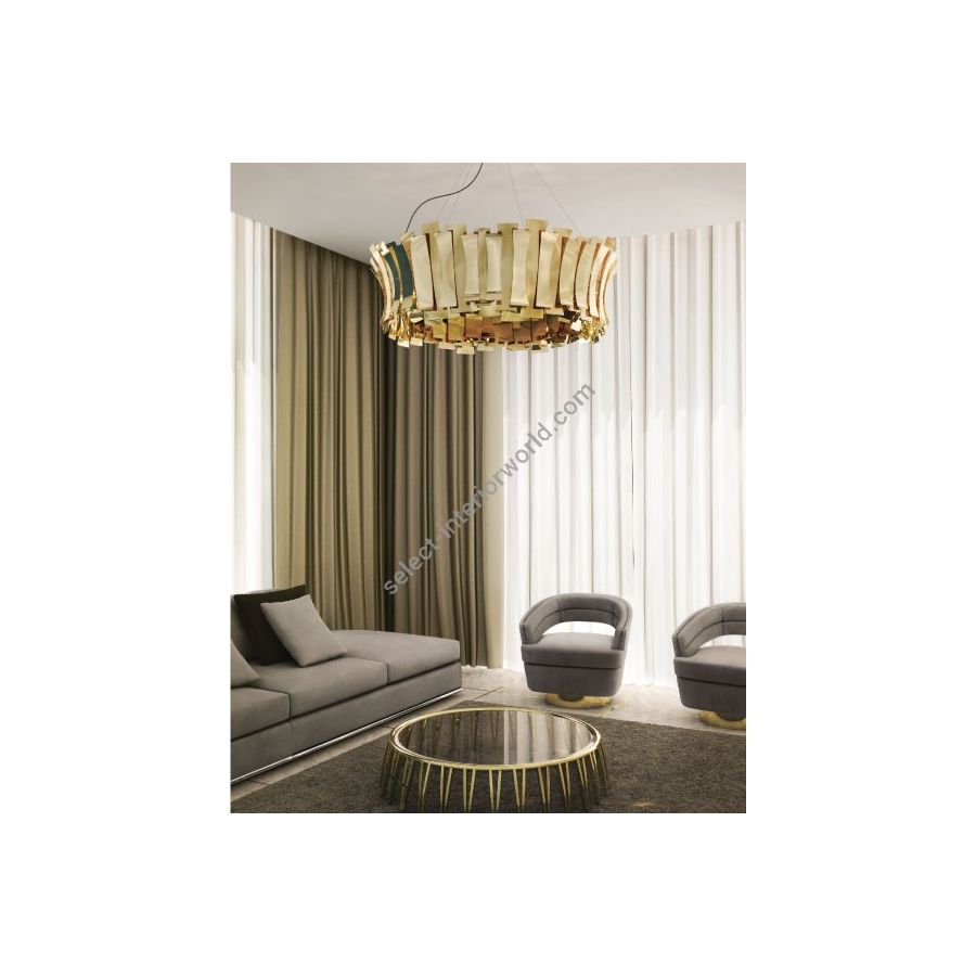 Inspired by the feminine glow cast by one of the greatest jazz singers of all times, DelightFULL has created Etta round suspension. It is a sophisticated and very functional chandelier lighting design suited for the most luxurious settings you can think of. It is handmade in brass, with the additional unique feature of each one of its leaves being shaped and assembled by hand. The gold brushed standard finish gives this brass chandelier a true sense of luxury. Seeing as this is a bespoke lighting design, every feature can be altered to meet your expectations and requests. Etta is the perfect chandelier lighting for a luxurious lobby at a five-star hotel, but it also looks amazing in a grand dining hall.