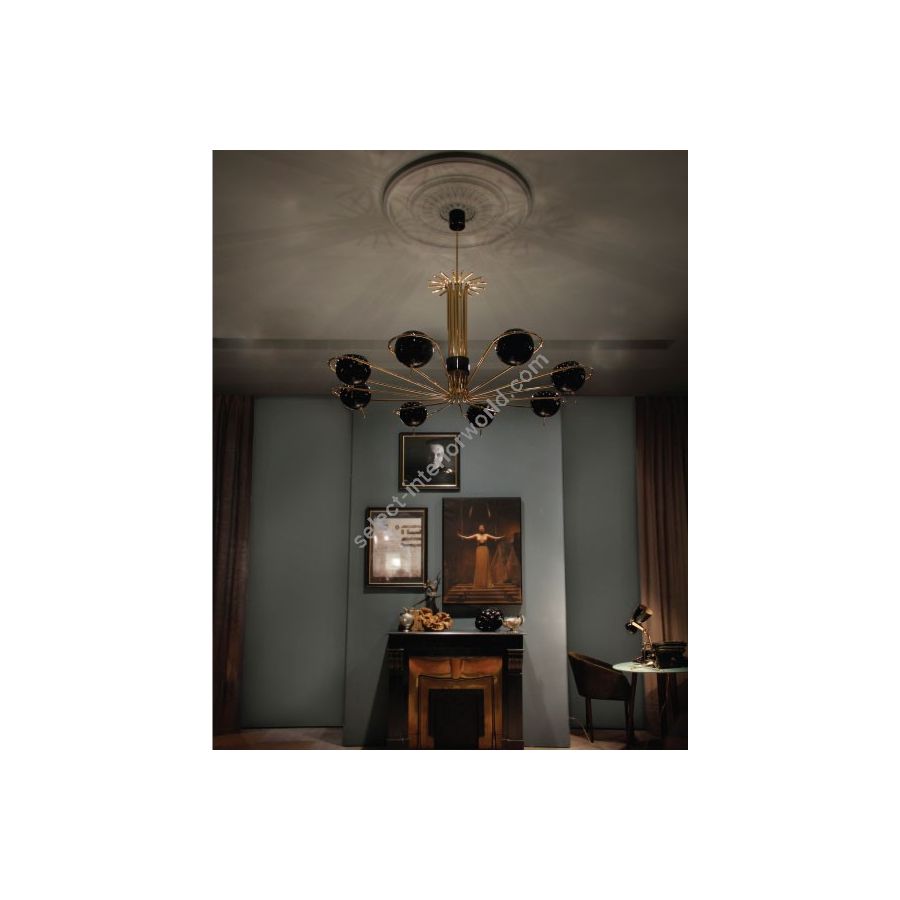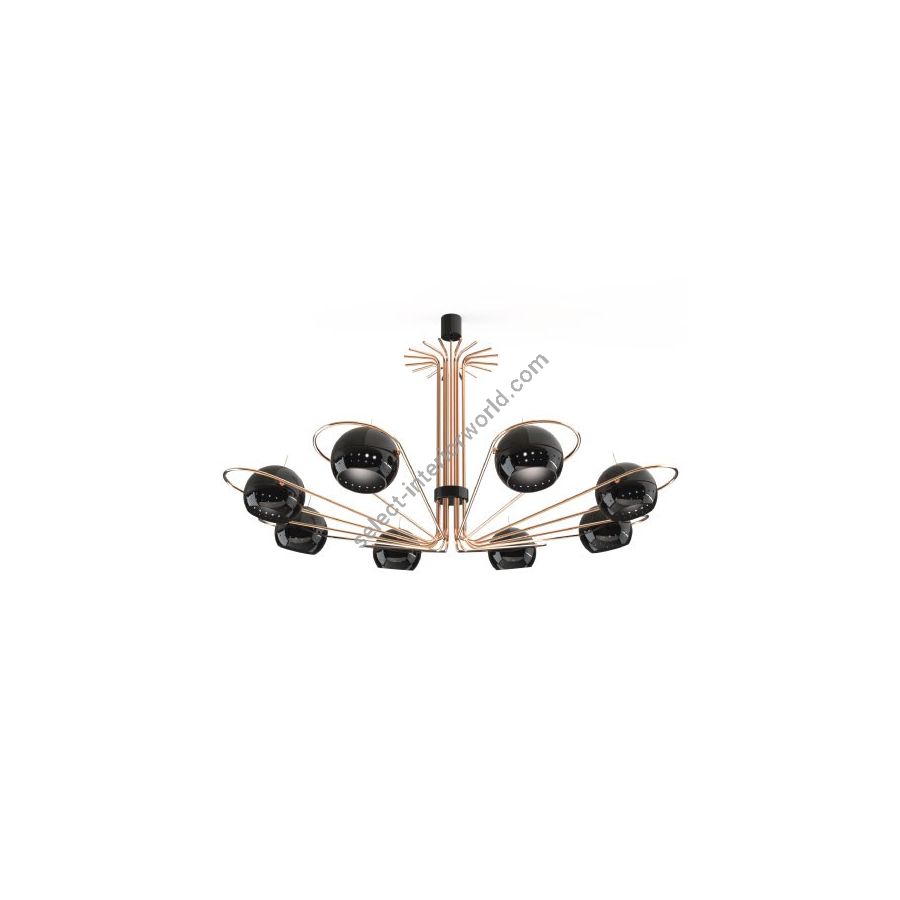 Neil is a modern chandelier with round arcs and spherical diffusers, that were inspired by the golden years of space exploration in the 60’s. It has 8 arms with rotating spheres to cast light to wherever you need in order to create the perfect mood - a rare feature on chandeliers. Therefore, this iron chandelier casts ambient light in all directions. It also offers the choice of having only 4 of the 8 diffusers lit on. With a structure handmade in iron and 8 lamp shades in iron, Neil black chandelier has a mid-century modern design with glossy black exterior and a matte black interior finishing. Ideal as a modern dining room lighting or as a centerpiece in your mid-century living room, Neil will add an innovative touch to your interior design.