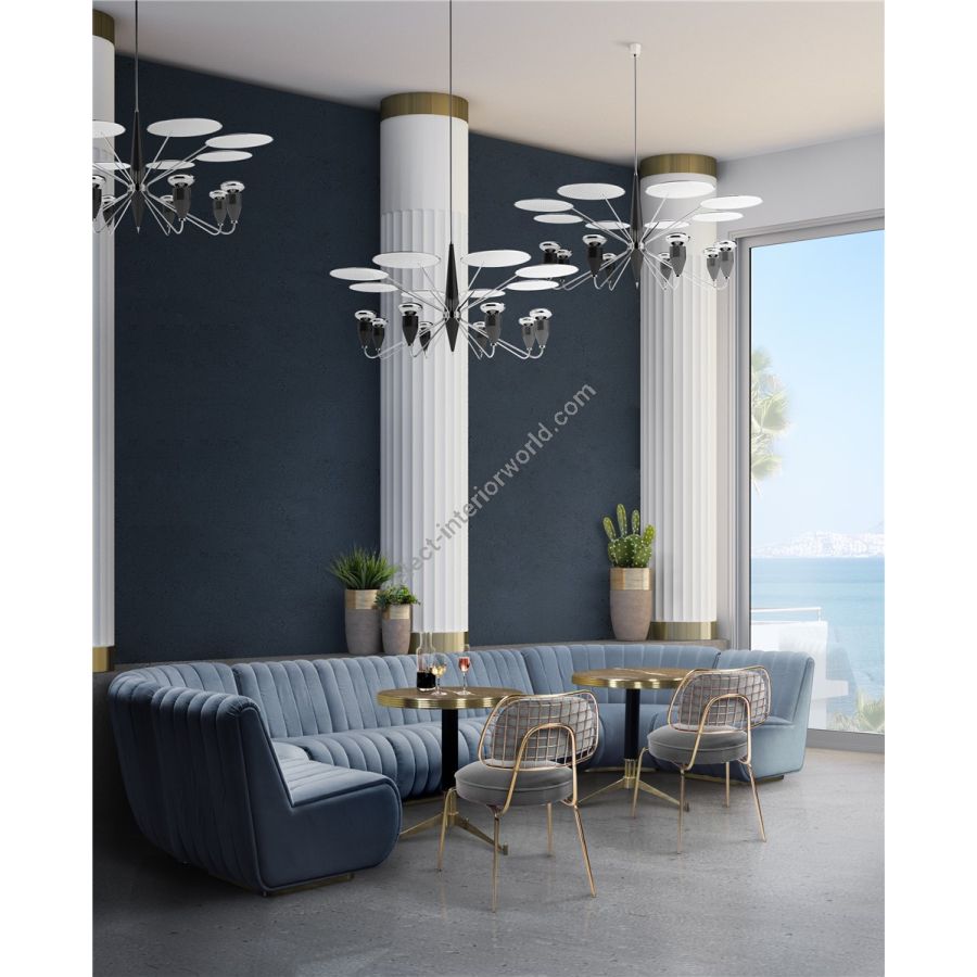 Peggy modern chandelier has a 60’s feel that won’t go unnoticed. With a structure handmade in brass and with a top cover in perforated steel, this unique lamp has a nickel plated and matte white finish. The dazzling lighting design lamp shades are in matte black, making an incredible contrast with the matte white top cover, that characterizes this contemporary chandelier. With almost 18 pounds, Peggy chandelier light also offers the choice of having only 4 of the 8 diffusers lit on. Peggy is a great modern lighting solution for your living room decor and can also be used as a modern dining room chandelier.