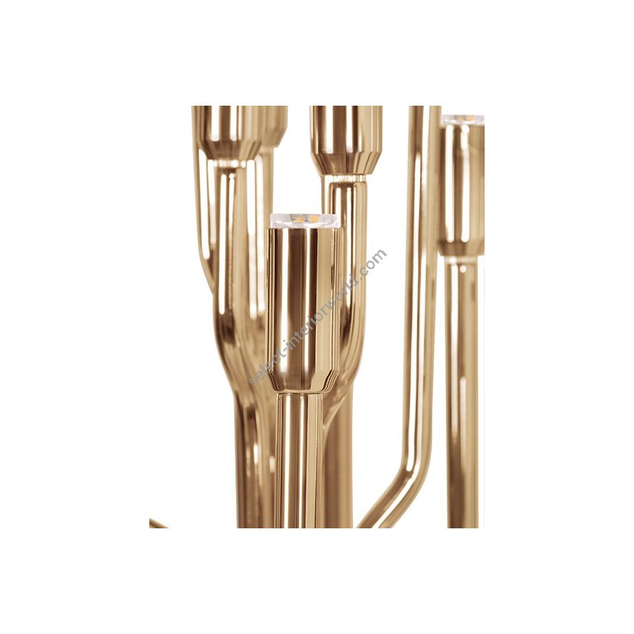 Inspired in Janis Joplin’s music “Best of The Best Gold”, Janis floor lamp recovers the golden jazz spirit of the 60’s. Covered by a golden bath, this entrance floor lamp was designed to make a powerful statement with its mid-century modern design. With almost 67 inches, Janis is 100% handmade in brass, boasting a high quality craftsmanship. This tall standing lamp fits beautifully in a modern entryway or in a classic living room corner, since it is an excellent match for both contemporary and classic decors.