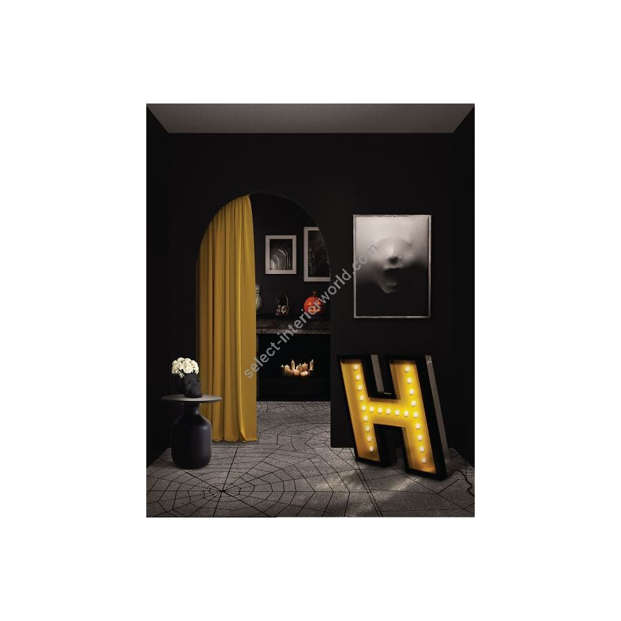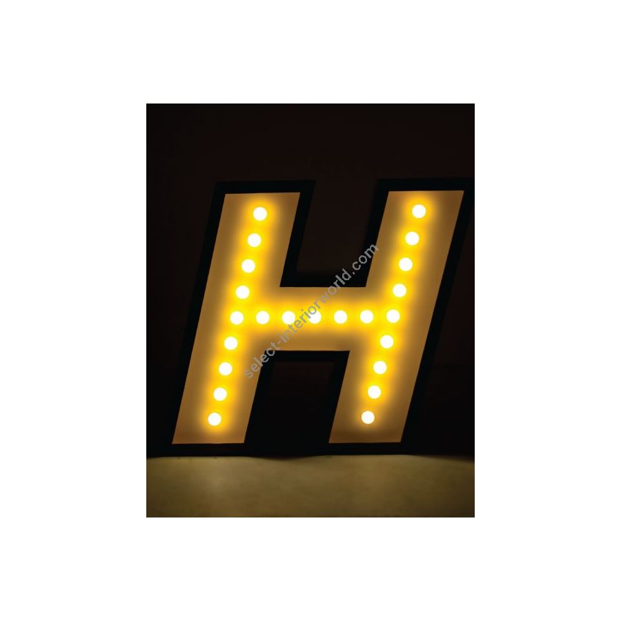 H stands for handmade and for one of the most beloved typefaces hits of this collection. Modern and energetic, this letter draws attention by its standard finishes in italic, with a yellow color and black outline. Made of shiny stainless steel and shining with 17 bulbs, this marquee letter design is available for colour customization and in a mini version! And its also able to put into your floor or your sleek wall. Made only for your interiors.