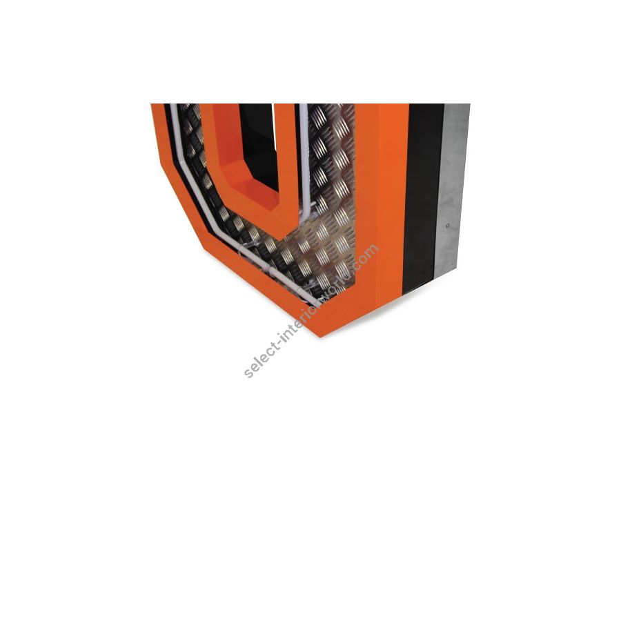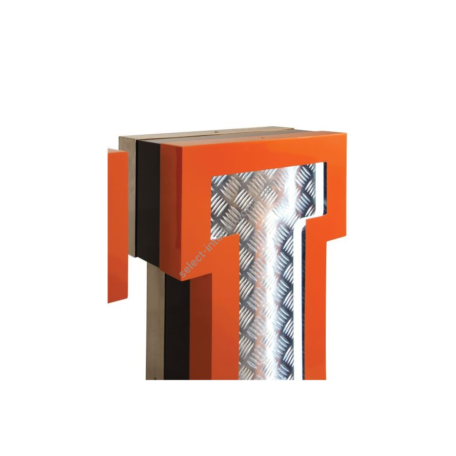 Inspired by the great 70's, the geometric lines and the exterior orange underlines that contour the aluminum fixture is a sign of the times ahead. Covered with diamond plated steel that reflects the white neon glow of the marquee lighting design is the ones to characterizes this lighting fixture. Creating a new aura in any design project, this handmade lighting design has a 1 meter in height. Versatile, you can put this lighting design on the wall or on the floor. Fitting for outdoors as well, you can customize your lighting design on demand.