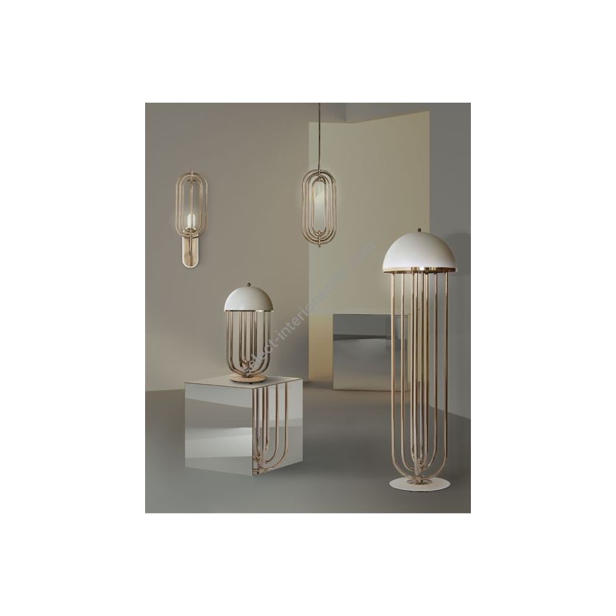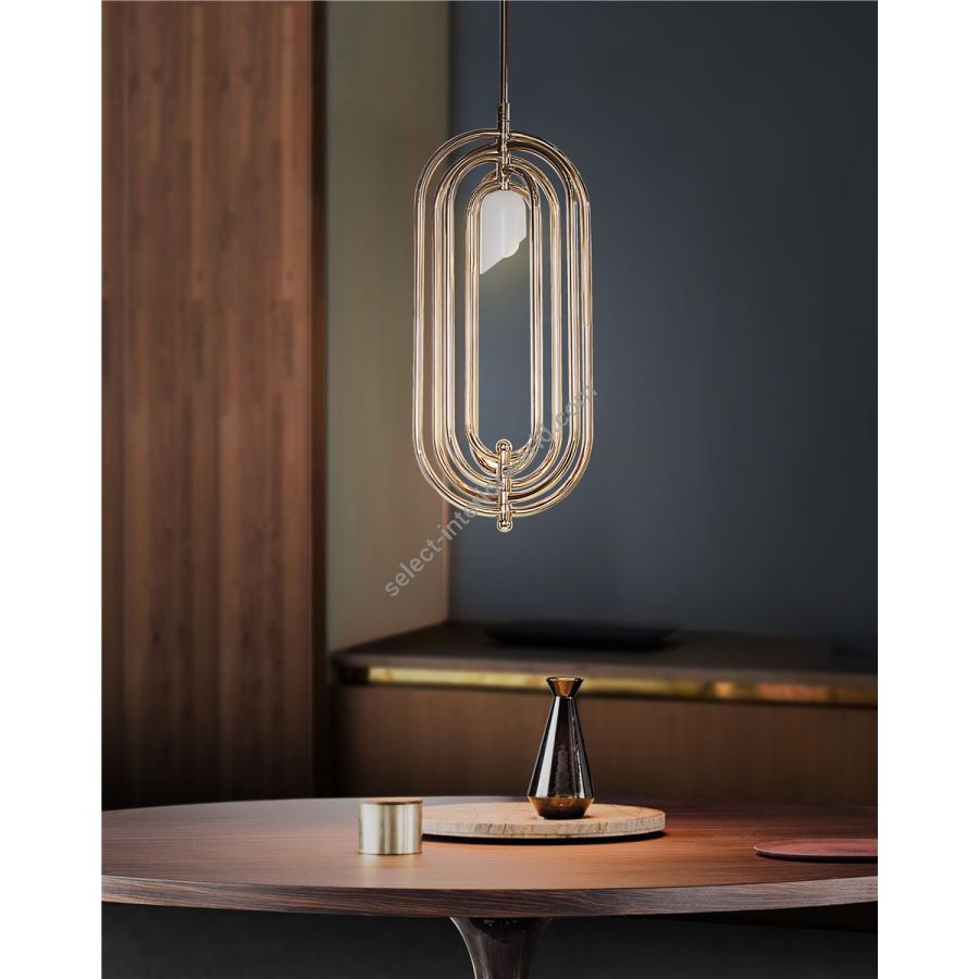 Inspired by the astonishing and memorable dance moves of the iconic pop singer, DelightFULL’s design team created the Turner family. Turner pendant lamp is an art deco lighting fixtures handmade in brass and aluminum that boasts all the most special elements of this design movement. The body has five gold plated finished movable arcs, which can all be rotated into the desired position, giving this modern pendant lamp a sense of fun. The small shade on the center is lacquered a matte white, but it is customizable with any RAL color of your choosing. Turner suspension light is a versatile piece, that can be used in almost any room of your house. However, it looks its best when used as an alternative bedside lamp, or when placed in an art deco inspired living room.