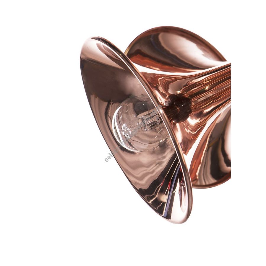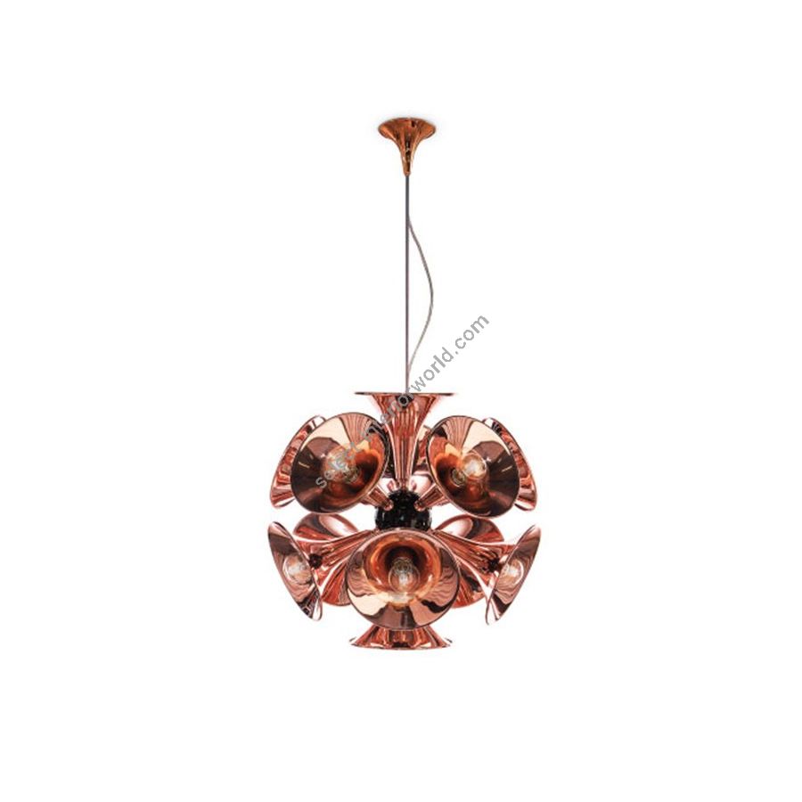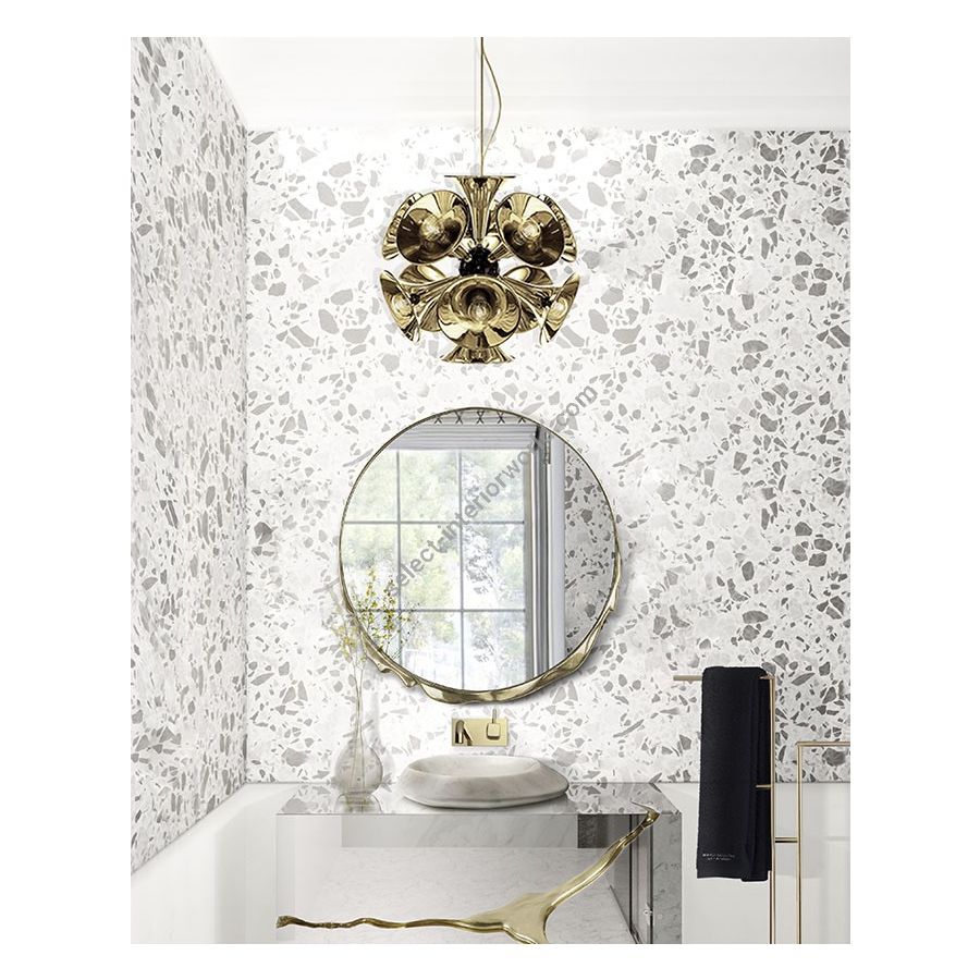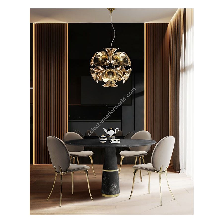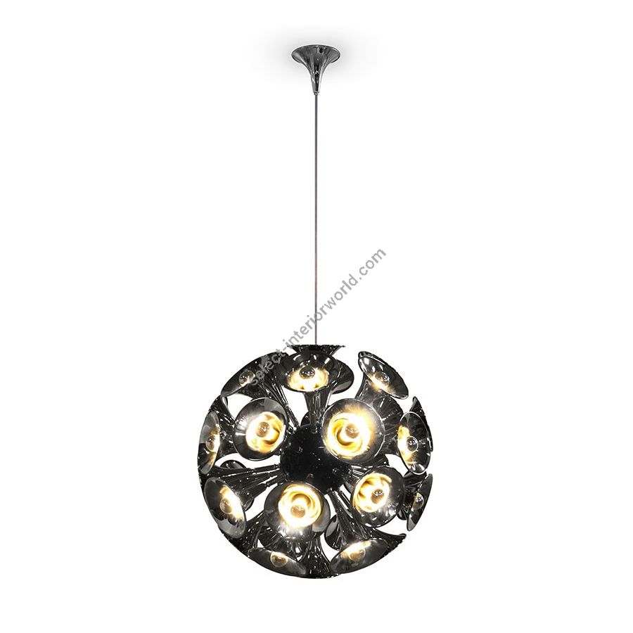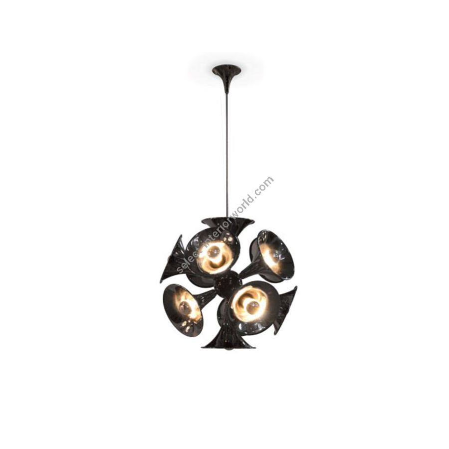 Inspired by the american trumpet player Chris Botti as a tribute to jazz music, Botti pendant lamp is a slightly smaller version of the modern chandelier with 15 trumpet-shaped shapes that stretch out from the center, creating a perfect sphere. It is handmade in brass, covered in a gold-plated finish. The round base at the center of the suspended light is handmade in aluminum and lacquered a glossy black, but it can also be lacquered a glossy white to meet the needs of the most exquisite sets. With a retro vibe, this art deco suspension lamp is best suited for a vintage living room, or mid-century modern bedroom.