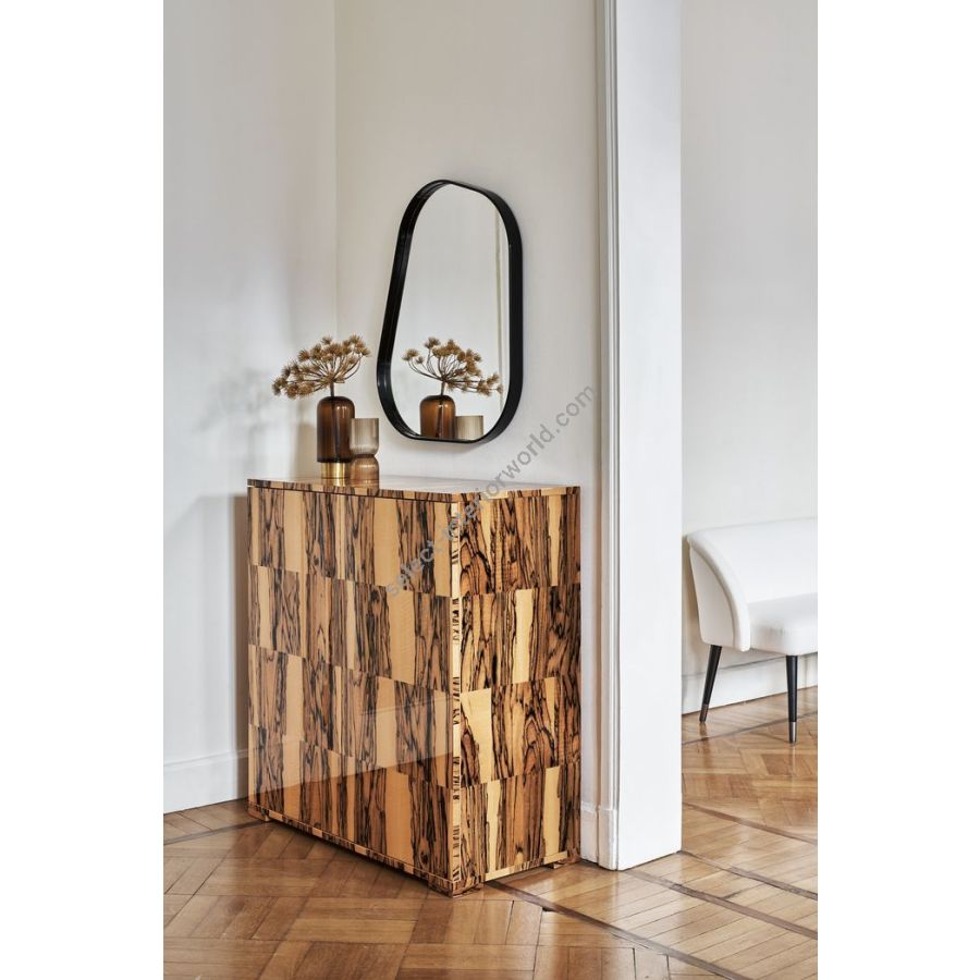 Reinterpreting the concept of traditional storage in an eye-catching design, this exclusive cabinet will be the focal point in a modern living room and dining room. The luxurious checkerboard pattern is crafted by masterfully assembling Albin wood pieces, whose stunning natural wood grains are enhanced by a gloss finish. The two doors have a push and pull opening system to preserve the harmony of the design and reveal an interior storage of glossy natural maple with two shelves. A piece of great visual impact, this cabinet is best displayed with minimal accents.