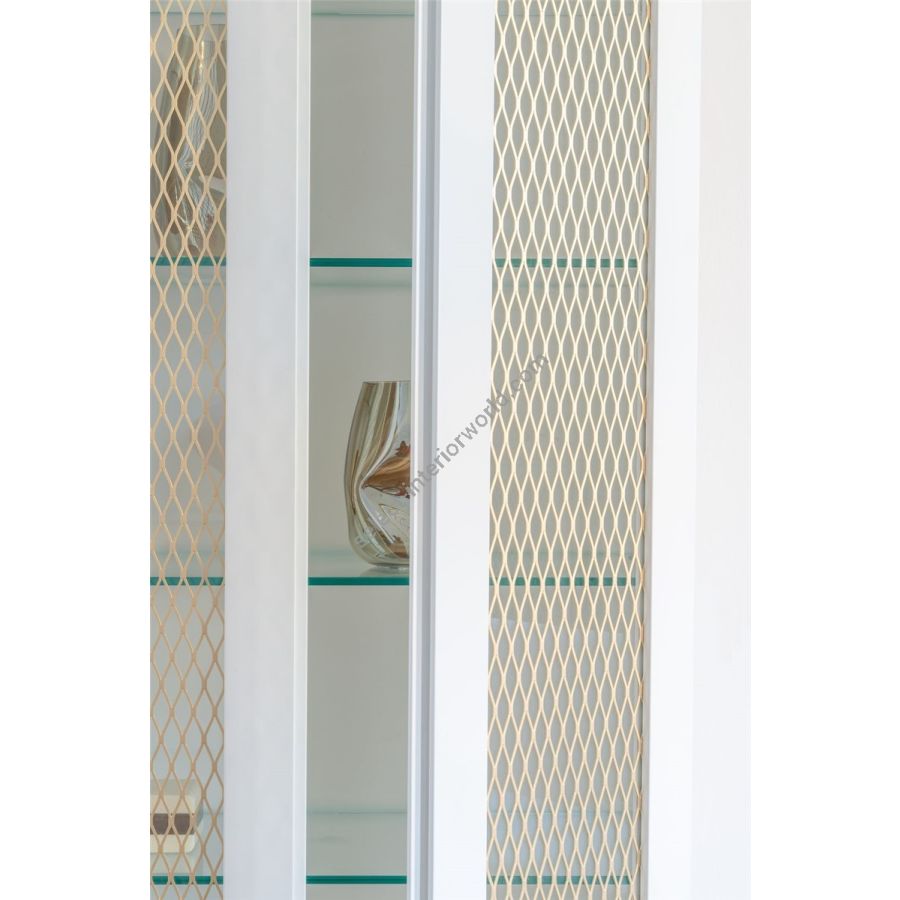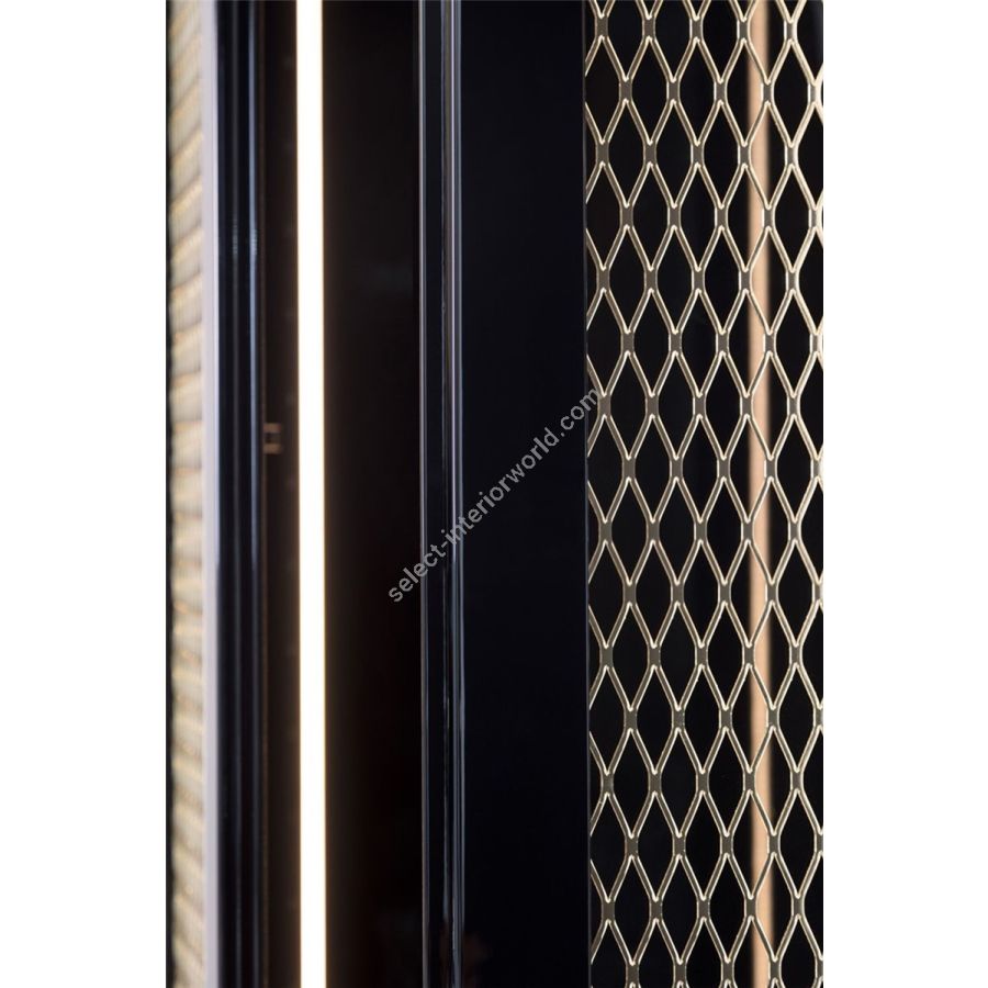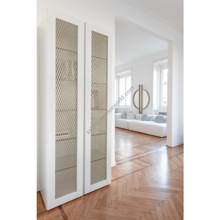 The Soho cabinet is available in gloss or mat lacquered and comes with metal grids in gloss brass, satin brass, bronze and gloss chrome. Interior shelves available in bronzed glass, clear transparent or fumè. The glass doors behind the metal grids are available in mirror, bronzed, fumè or clear transparent.| Dimensions (HxWxD): | cm: 222x88x44 / inch: 87.4"x34.65"x17.32" |