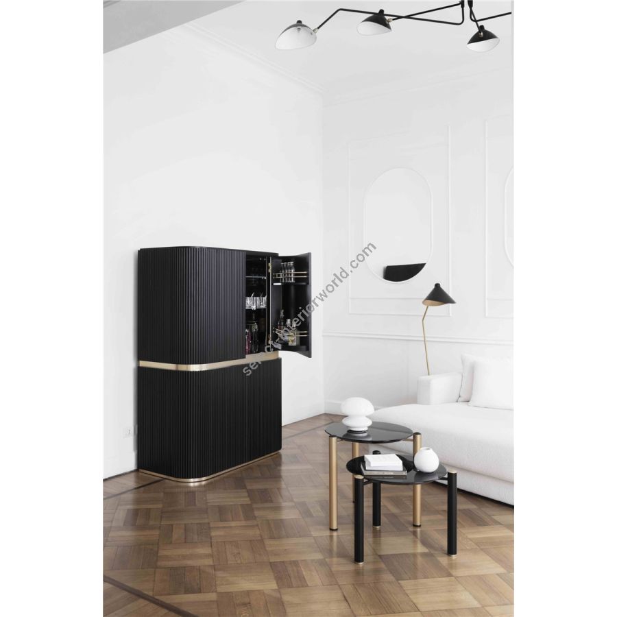 A very precious piece of furniture, Tiffany creates an atmosphere in the balance between the Mediterranean dolce vita, an elegant summer drink in Manhattan, an intimate and sumptuous ambience of a classic cigar room. All of it enters the house through the curved and proportioned lines, the vertical canneté surfaces, the polished or satin metal bands, and above all the beautiful interiors: those of a bar cabinet that is certainly the protagonist – a protagonist to never take for granted, and with a strong individuality. For a perception of luxury that is not made up of pomp, but of personality, atmosphere and passion.