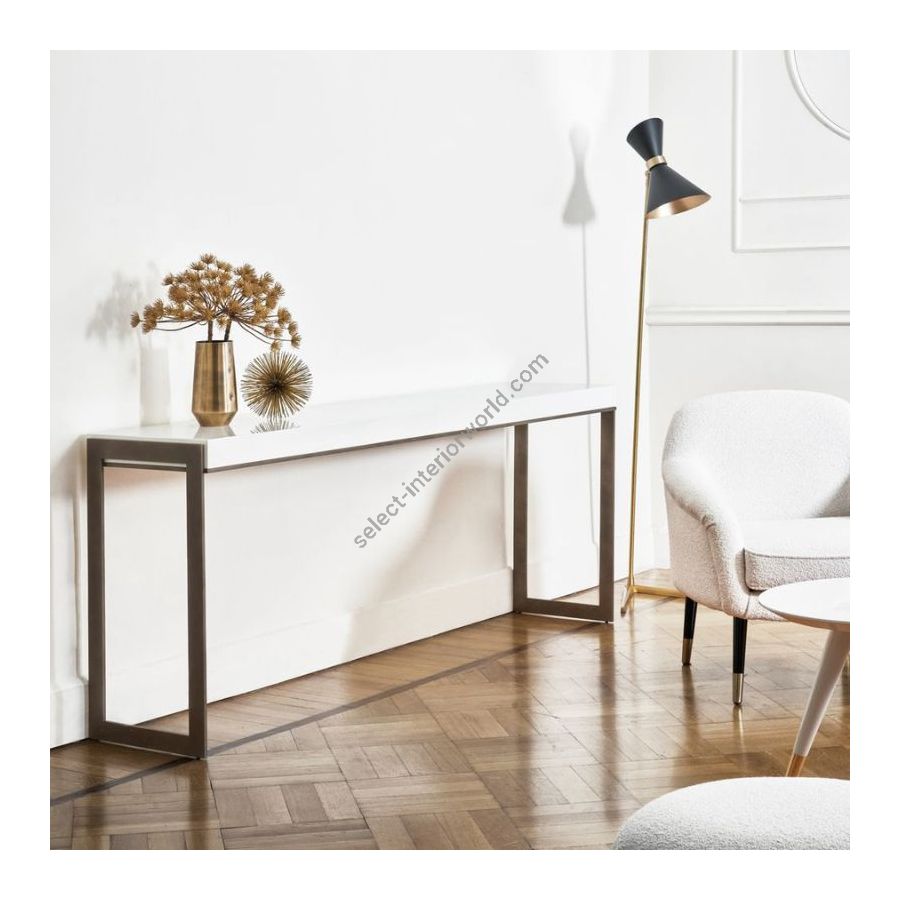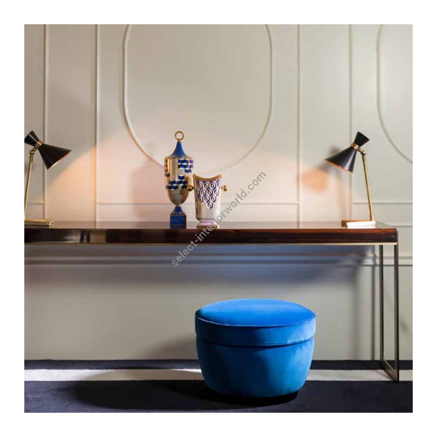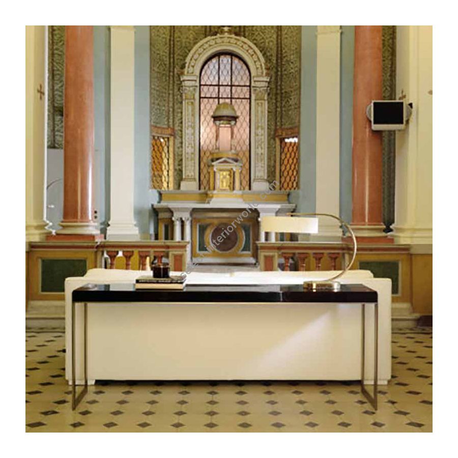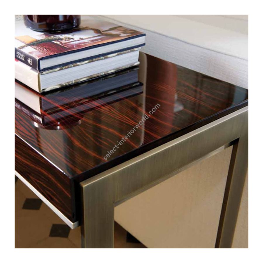 Stephanie console is both perfect and minimal. Designed with the purpose of representing through a contemporary way the concepts of order and accuracy. The top is available both lacquered and ebony Makassar veneer. It is supported by two very thin and vertical pillars that are joined by a central element which goes along the whole surface of the top and outlines the lower profile.
