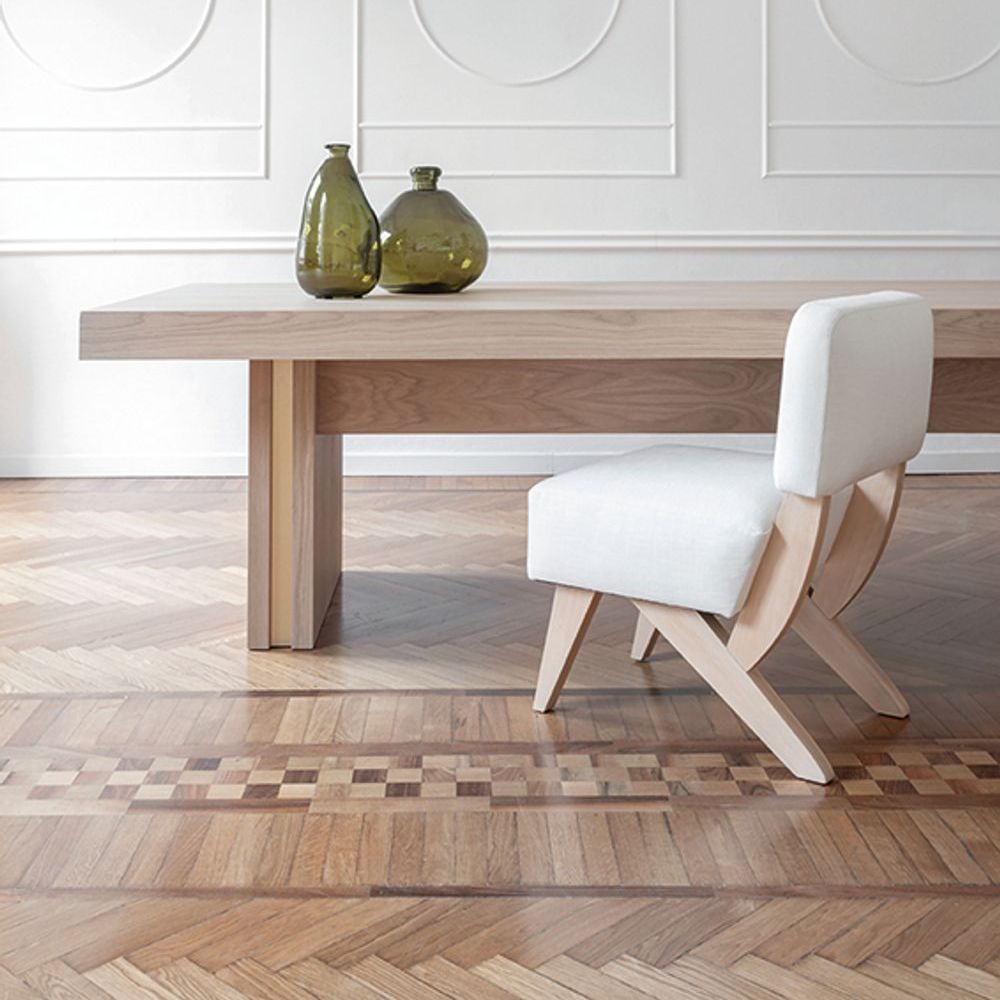 Our Bernadette dinner chair has a delicate imprint of the Seventies. Comfortable and relaxed in the seat, it fascinates with the refined shape of the legs, whose lacquered wood culminates in a metal tip: a seductive and confident detail like an accomplice smile. The Bernadette Dinner chair is part of a family that also includes the dinner bench, the barstool, the armchair, the small sofa and the pouf. Due to the attention to tailor-made details and her noble personality, Bernadette embodies the DOM Edizioni philosophy at its best.