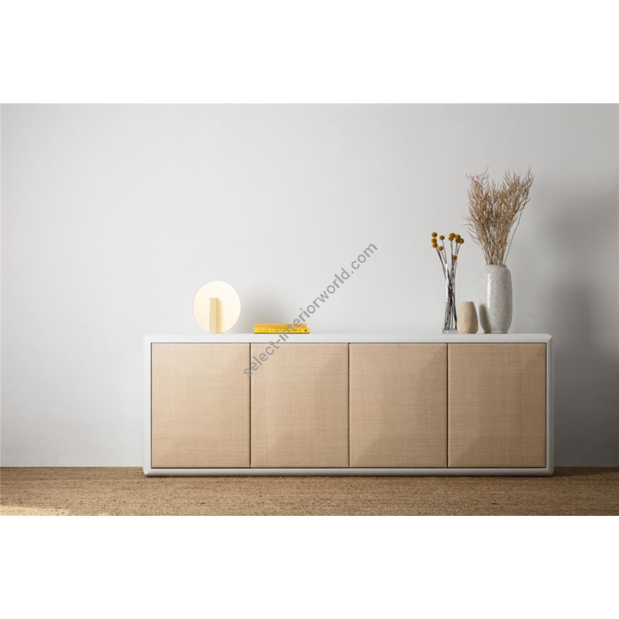 Structure and interiors in white/ivory/black mat lacquered. 2 compartments, 1 internal shelf for each compartment. Four doors covered in raffia sand/camel with push-pull opening.| Dimensions (HxWxD): | cm: 80x230x46 / inch: 31.5"x90.55"x18.11" |