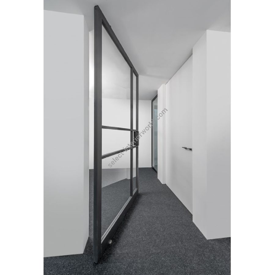 The arrangement and division of the glass strips and the surface of the wooden frame offer you individualisation options, whether in black steel look, with effect lacquer or as a natural wooden surface to match the floor.You can design (have designed) a Pivot glass door whose functionality and effect adapt to the spatial expression you desire.