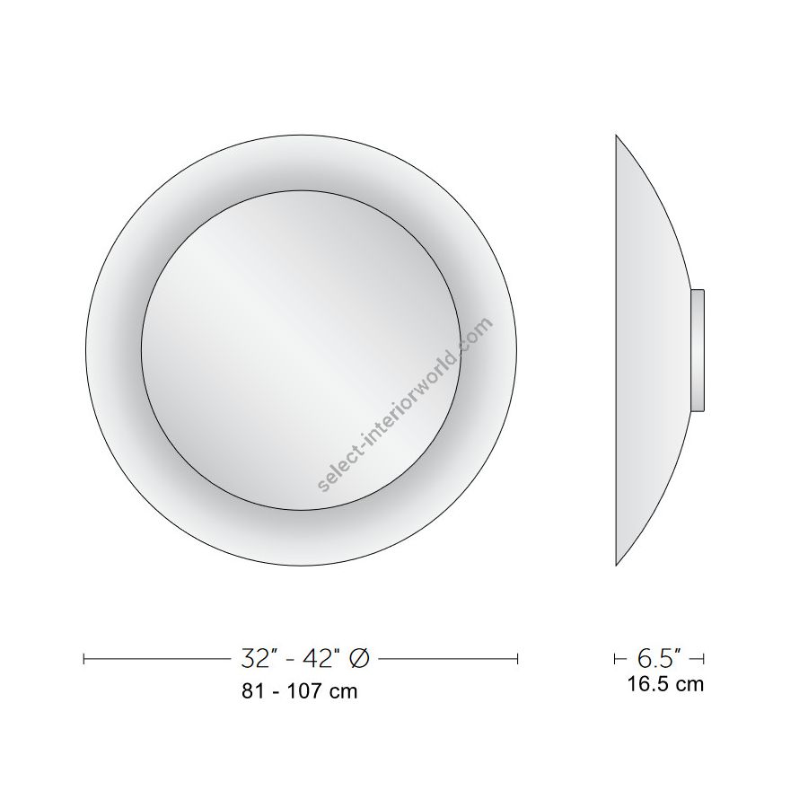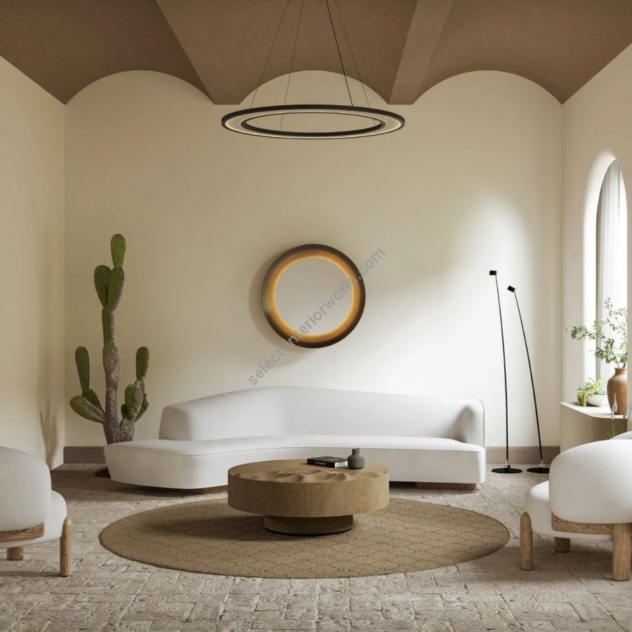 The Eclipse Mirror is designed by Schuyler Sweet which is a perfect round mirror eclipsing a soft halo of warm indirect light in the surround metal spinning.