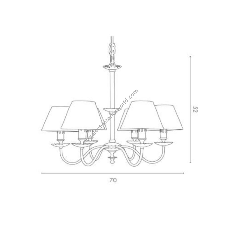 Chandelier with six lights in aged brass with fabric lamp shades.