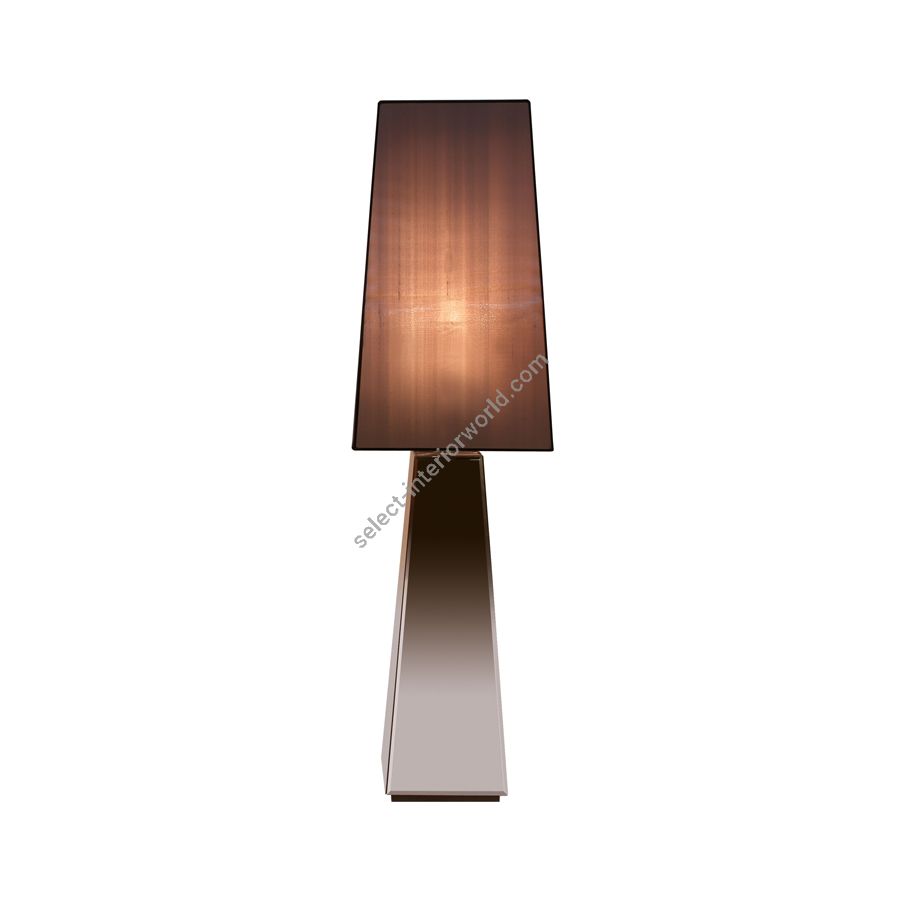 Floor lamp with structure covered in smoked bevelled mirror. Brass details in polished black nickel finish. Lampshade in linen fabric mixed with cotton.