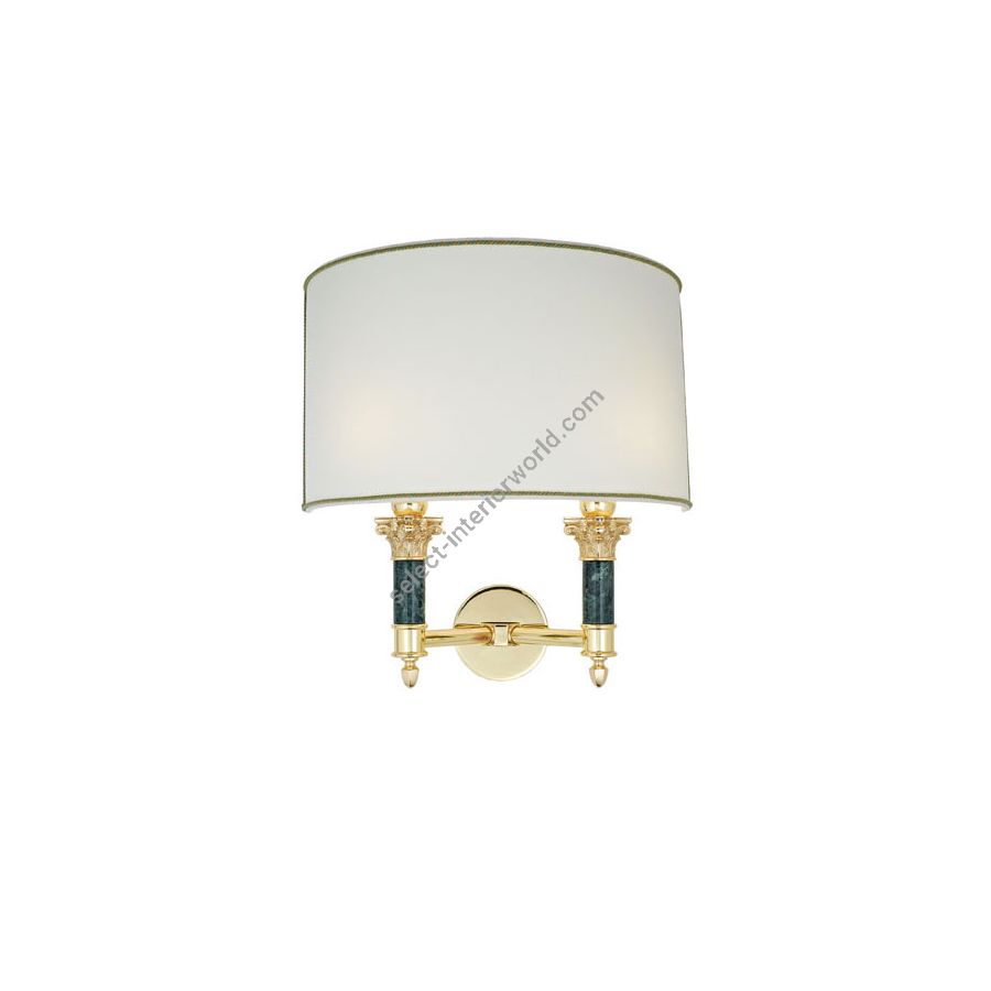 Wall lamp with two lights in metal and details in green marble with fabric lamp shade.