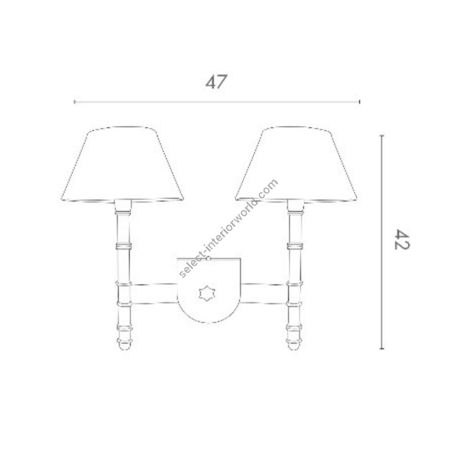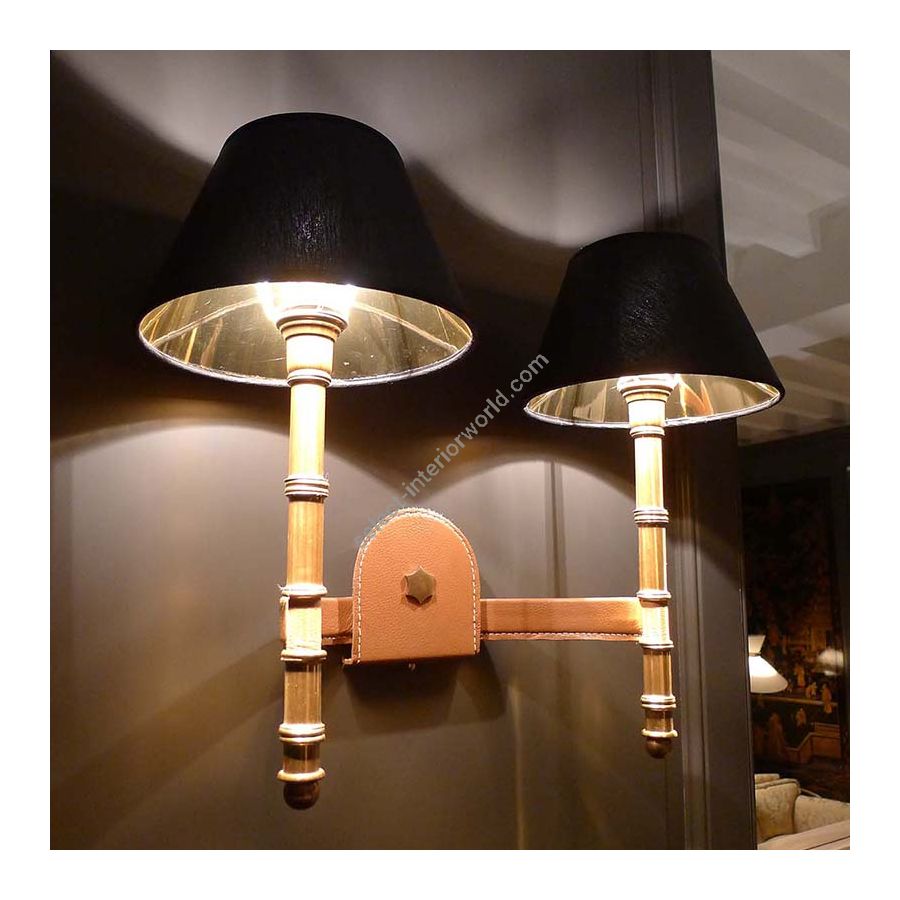 Lamp for wall installation mounting bracket for fixing at wall. Double arms structure in brass and metal with leather details and fabric lampshades.