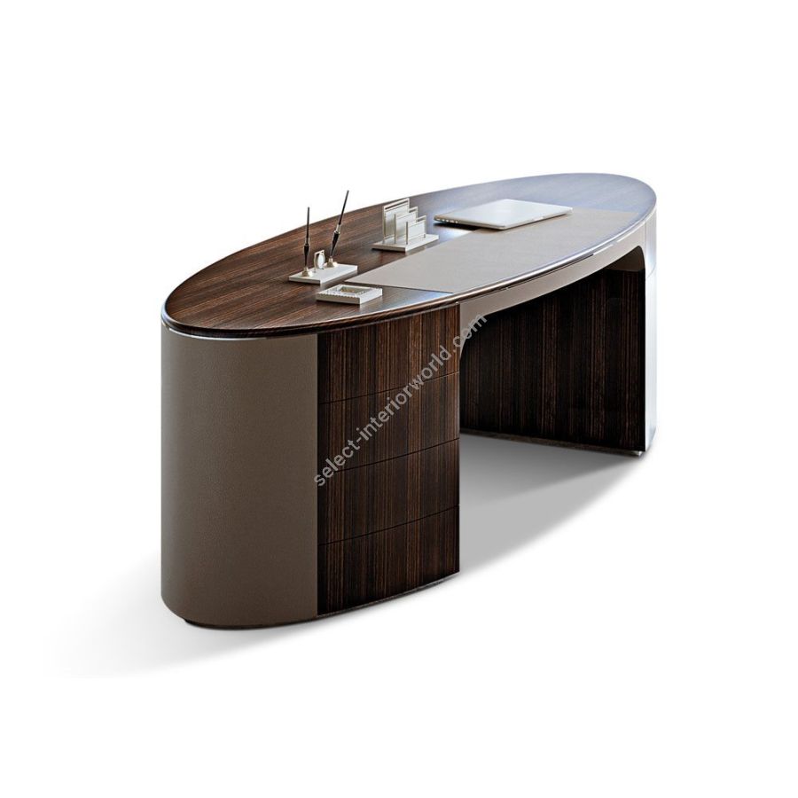 Elliptical desk with a wooden bridge structure in the finishes: Matt eucalyptus, Matt ebony, Matt sycamore frisè. Or covered in coloured leather from the catalogue. The desk has two chests of drawers incorporated into the structure. Each has 4 drawers with fronts in wood or leather. The elliptical top is in wood with the same finish as the structures with leather inserts. Under the top, there is a decorative metal profile in the following finishes: Satined champagne, Bright/satined Burnished, Shaded copper, Bright/satined shaded brown, Bright/satined Black rose, Bright/satined light gold, Bright/satined chrome, Bright/satined black chrome, Matt satined bronze. A cable hole is available on request