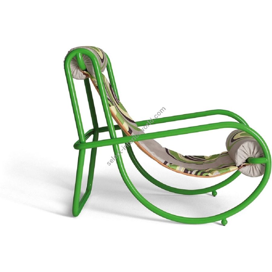 I tubolari in acciaio ripercorrono perfettamente il profilo della seduta e si uniscono simmetrici nel continuum dei braccioli. La lucida verniciatura è disponibile in più colori ed enfatizza il design giocoso dell’elemento.