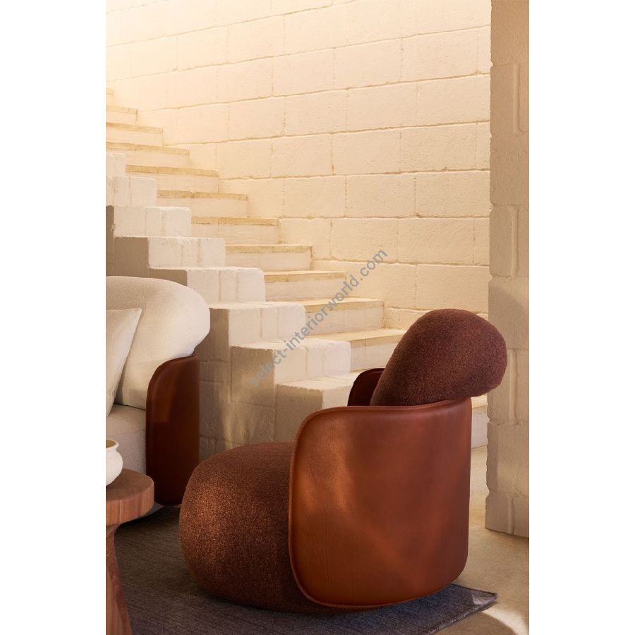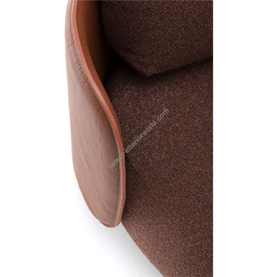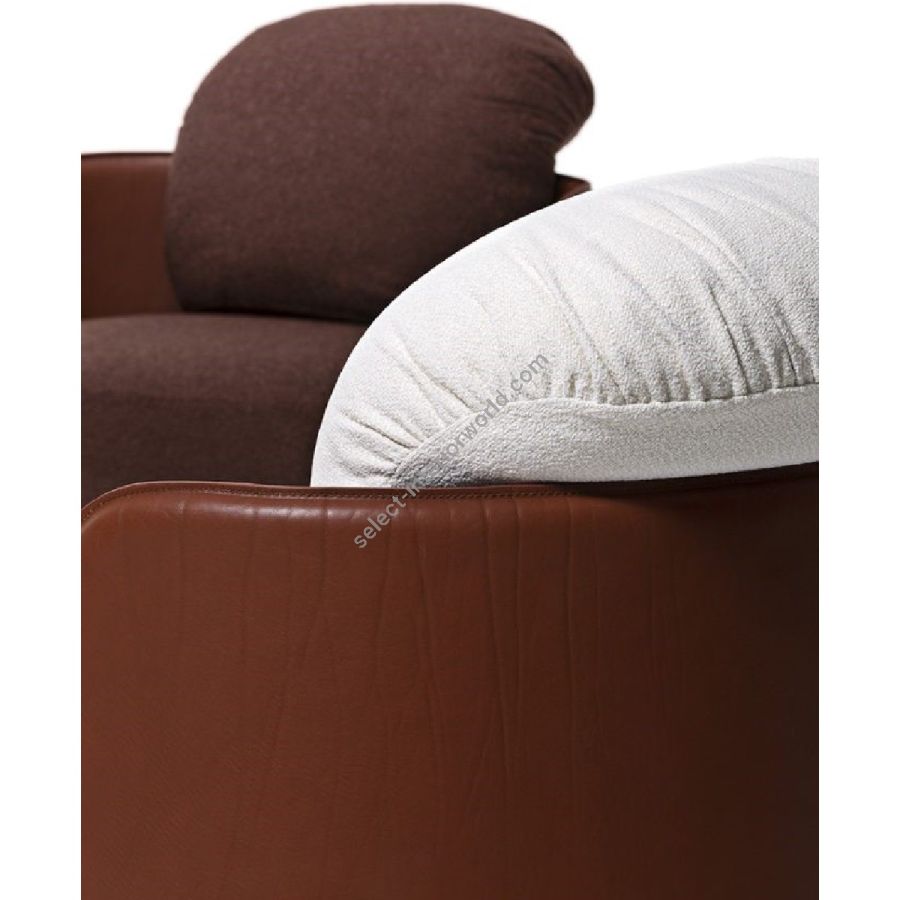 Lo schienale rigido in cuoio accoglie i volumi soffici della seduta e del cuscino, in un abbraccio che esalta una visione giocosa e allo stesso tempo sofisticata del design.