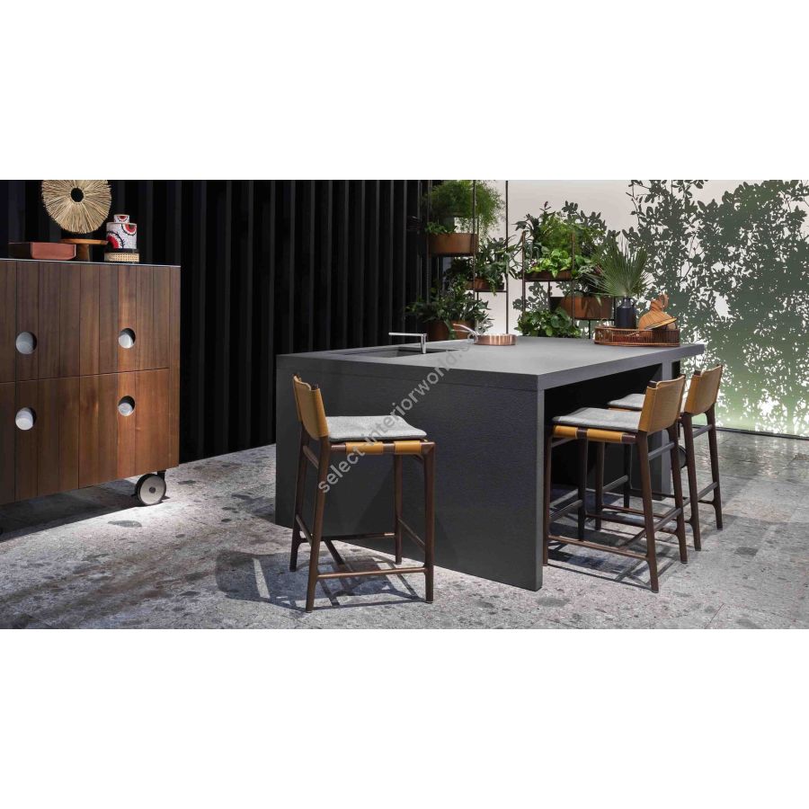 Un legno nobile ed estremamente resistente: mogano Sapelli arricchisce Levante Stool con le sue pregiate venature. La finitura, a scelta tra Mogano opaco, Barrique e Lucido Mediterraneo, è il dettaglio che omaggia la maestria dell’artigianato italiano.