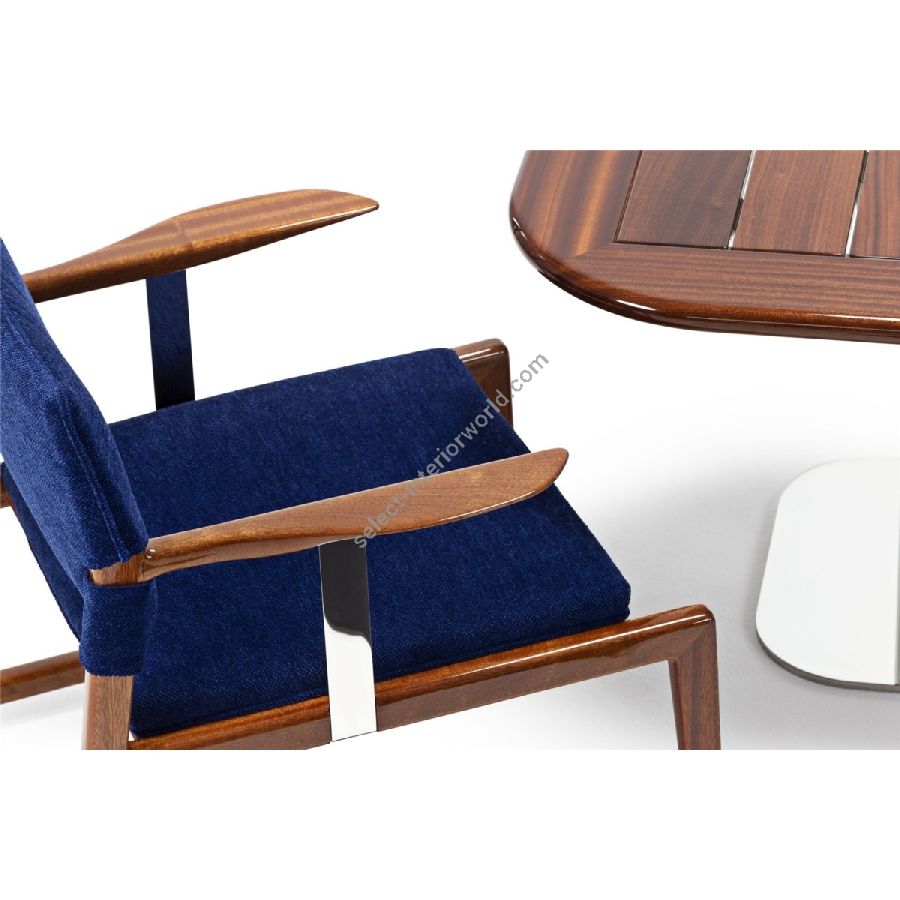 Il risultato di una lavorazione artigianale d’eccellenza, che unisce precisione tecnica e sensibilità estetica. Il piano in mogano viene sagomato e rifinito a mano secondo metodi tradizionali, esaltando ogni venatura con cura sartoriale. La base in acciaio inox, perfettamente lucidata, testimonia un approccio progettuale attento ad ogni dettaglio.