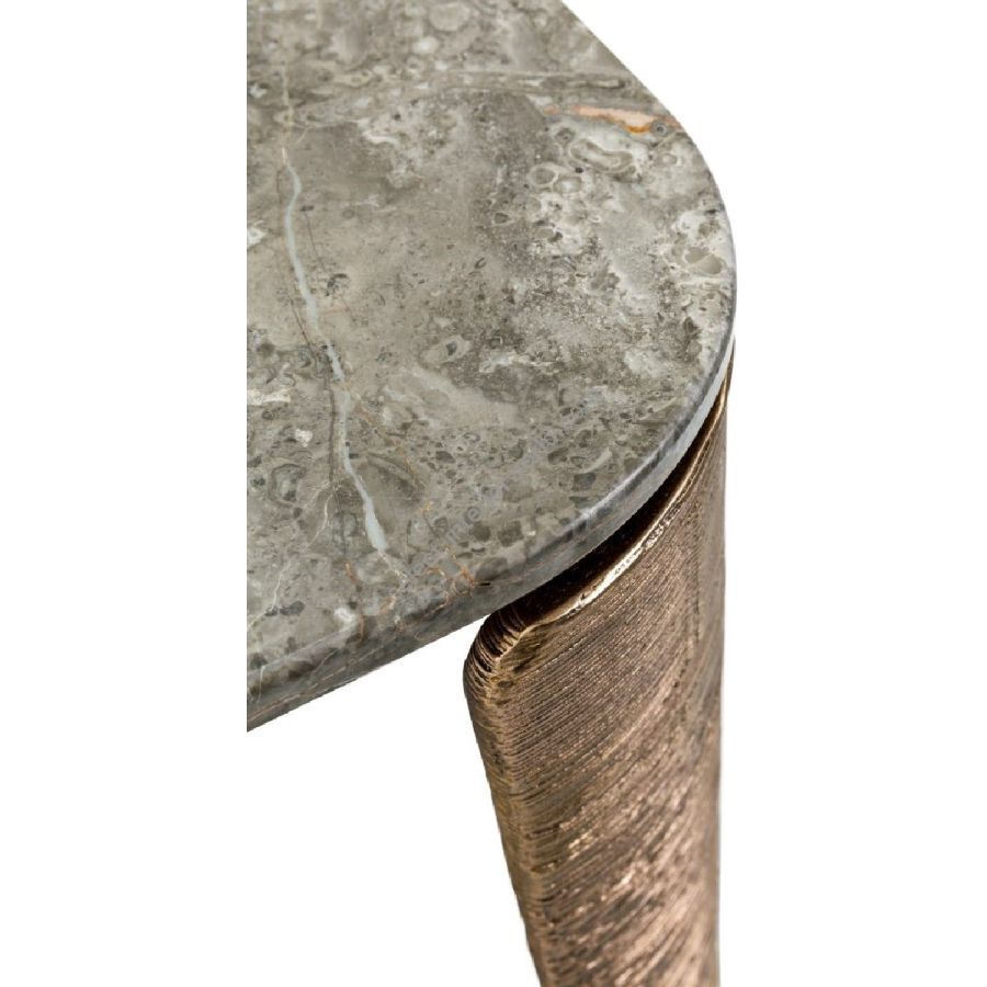 La nobiltà del piano in pietra o marmo incontra il fascino antico dei metalli. Le gambe sono disponibili sia in una lega di alluminio anticorodal, inalterabile nel tempo grazie all'elevata resistenza alla corrosione, sia in una versione in bronzo, che muta con il passare degli anni, assumendo un aspetto unico.