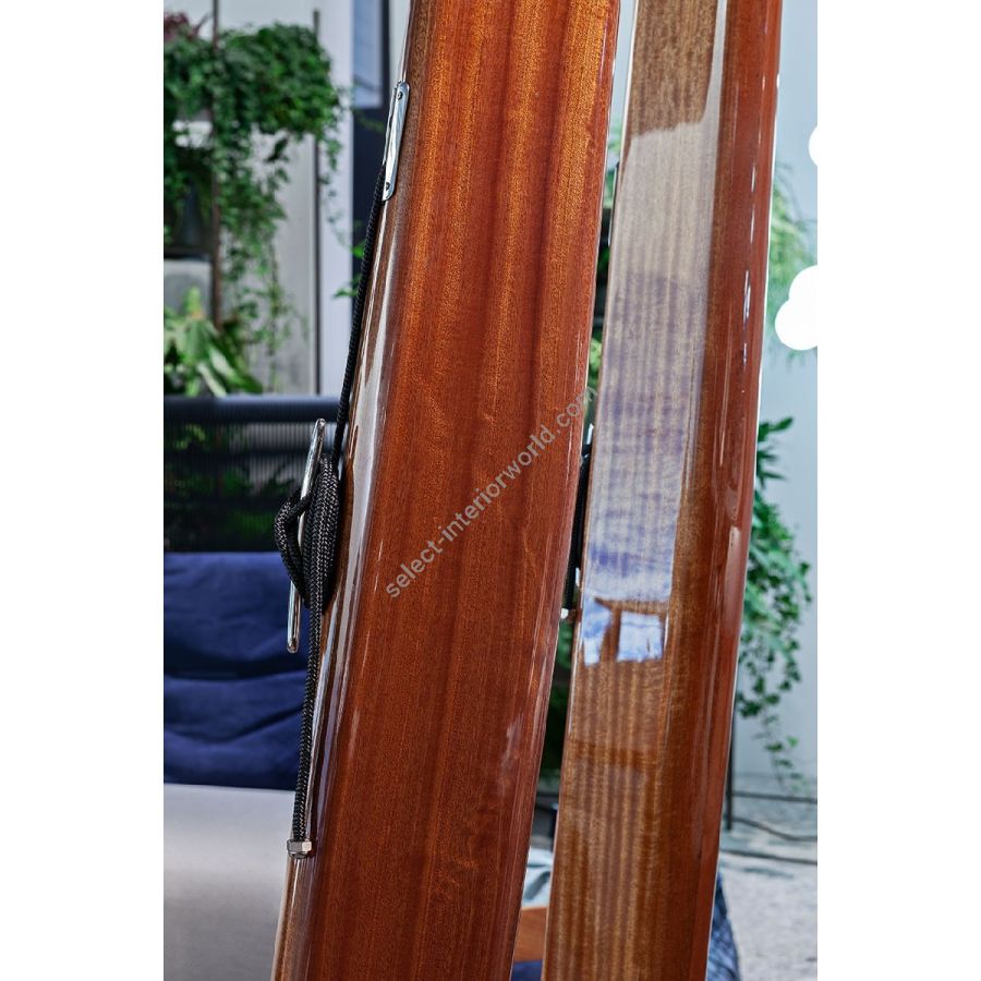 I piedistalli in acciaio inox creano riflessi di luce e conferiscono stabilità ai tralicci: un prezioso dettaglio che cattura lo sguardo in contrasto con gli elementi caldi in legno massiccio.