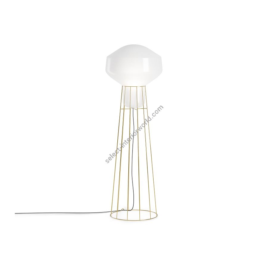 Floor lamp with shiny white blown glass diffuser and brass-plated metal structure.