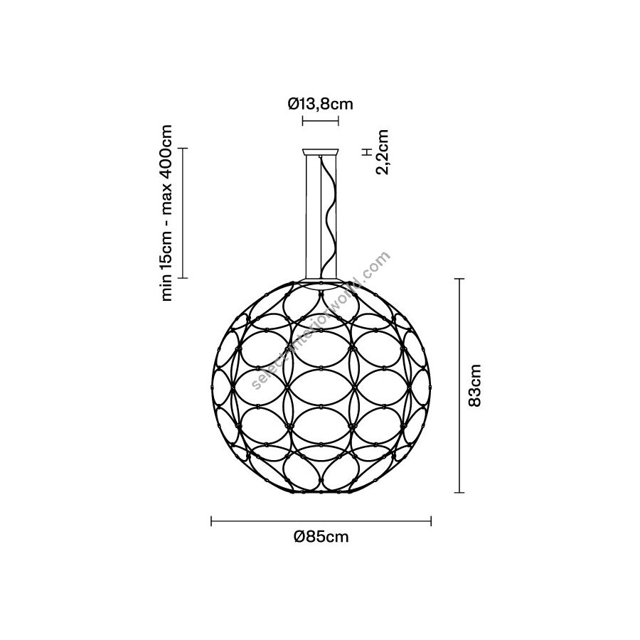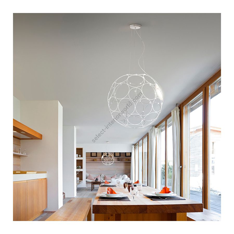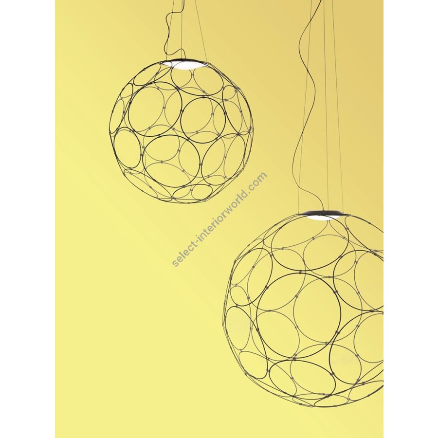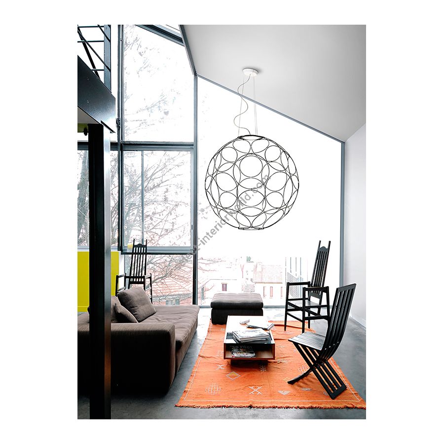 The collection consists of hanging lamps for indoor use, available in two sizes, both made up of 32 rings of varying diameter that are joined together to form a spherical shape. There are also two available finishes: polished white or anthracite grey. The choice of light source inside the metallic structure depends on personal tastes and needs. The lamp runs on mains power and is suitable for use with LED bulbs.
