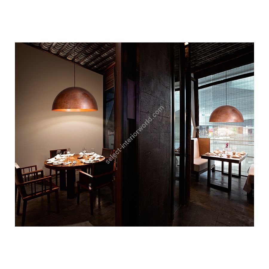Pendant lamp with a full copper structure, burnished outside and polished internally.