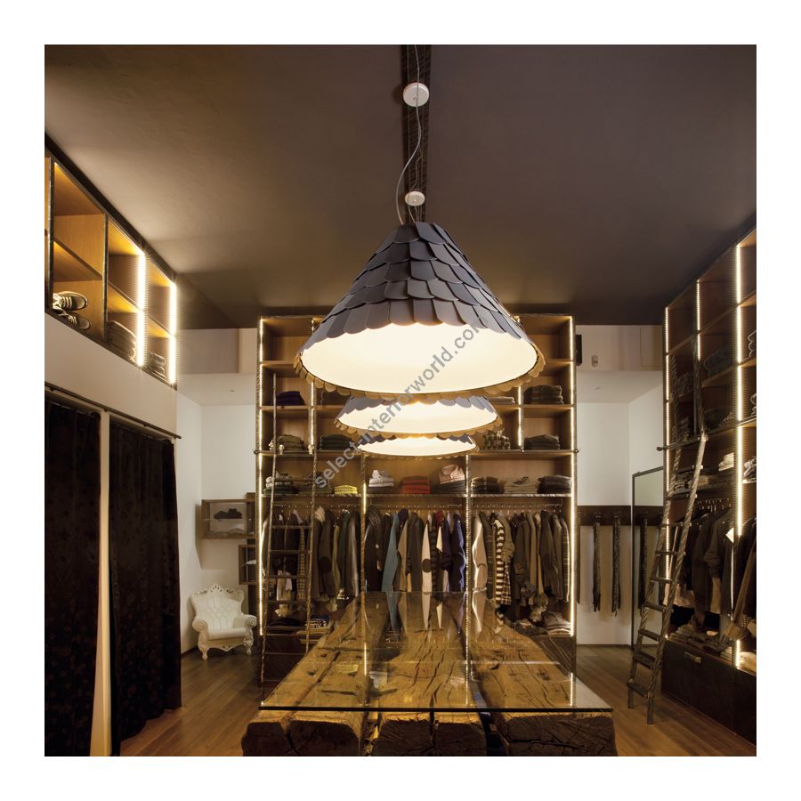 The Roofer hanging lamp has a very refined shape covered with many rubber tiles in different colours (white, green, brown and grey). It has a very playful style, therefore it is recommended to characterize environments that need to improve their style and design.