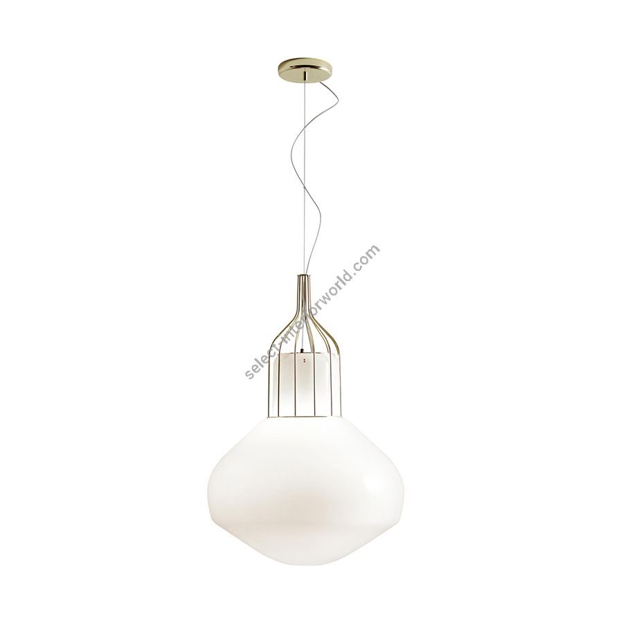 Pendant lamp with shiny white blown glass diffuser and brass-plated metal structure.