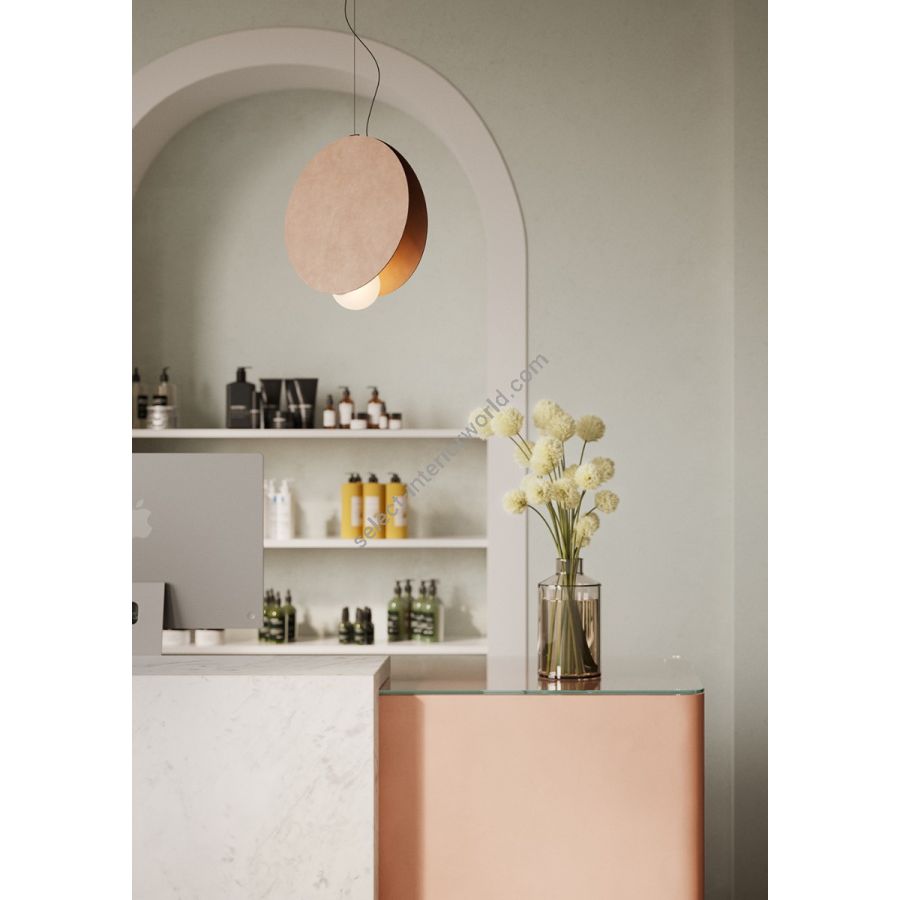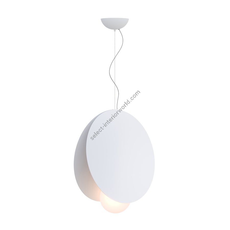 The Akoya collection comprises a indoor wall lamps in diameter of 30 cm and two pendant lamps in diameters of 30 cm and 60 cm. It is made of two metal discs (available in white, anthracite, corten and bronze finishes) containing a blown glass diffuser. The light source is a high-efficiency LED with integrated power supply and dimmable with phase cut.