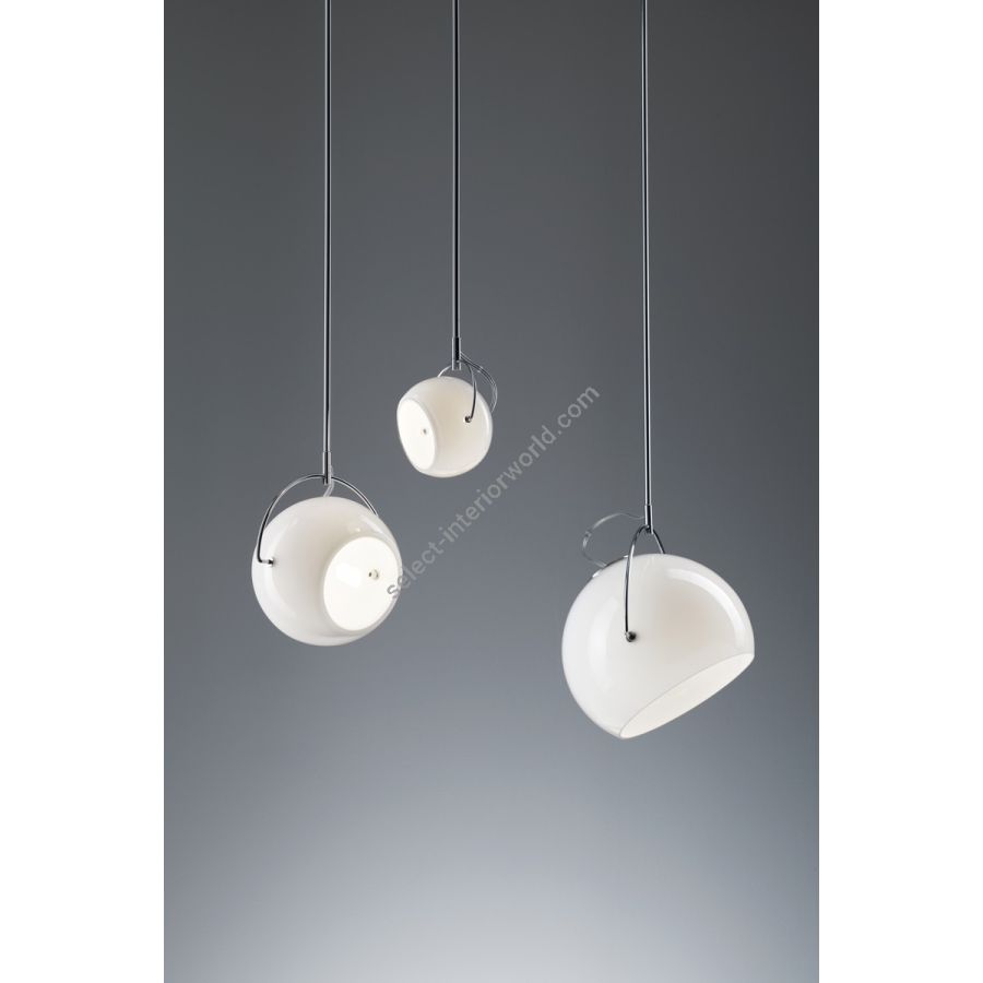 Pendant lamp with polished chrome-plated structure. Adjustable polished white blown glass diffuser.