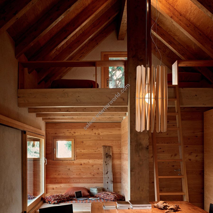 The Stick cylinder pendant lamp is available with diffuser in two sizes and uses natural wood. Its particular finish makes it suitable for ecological and modern environments. In the home, it is ideal in the kitchen and the living room or in the office in the entrance area. The bulb can be halogen or LED.