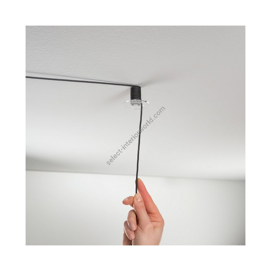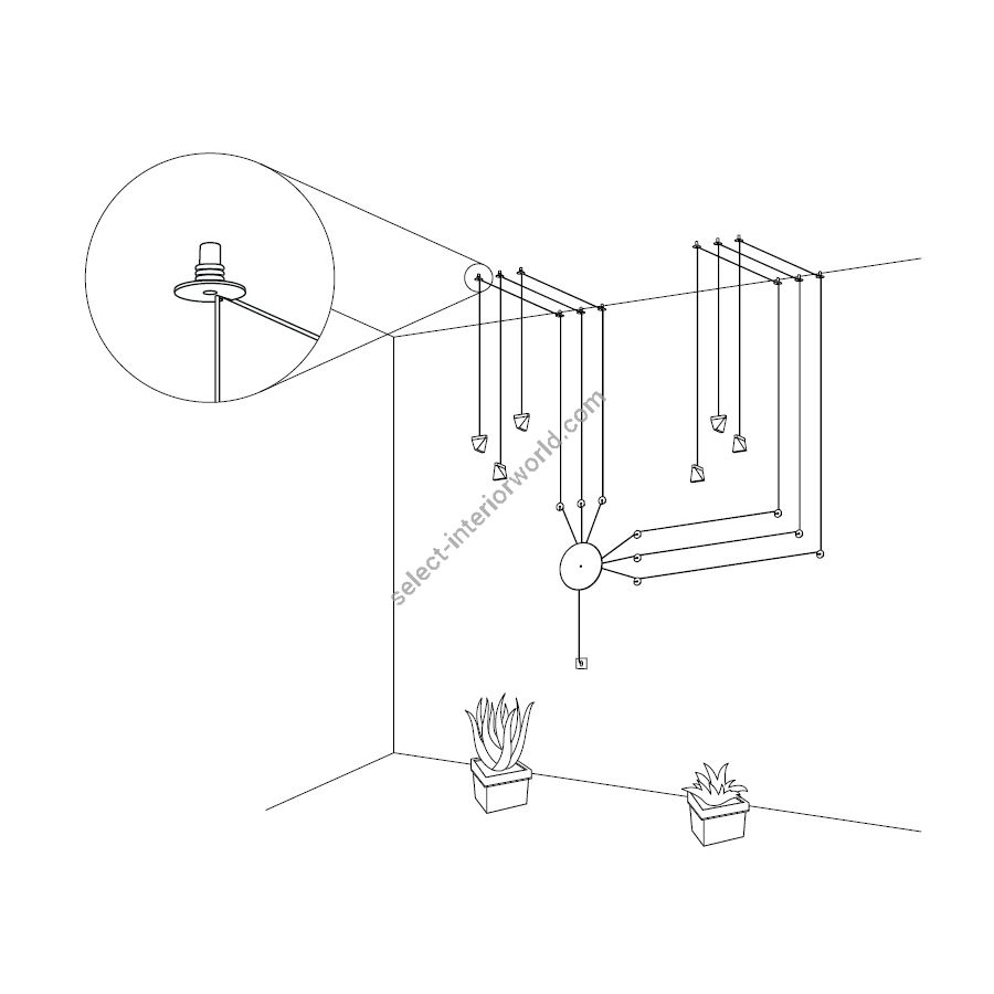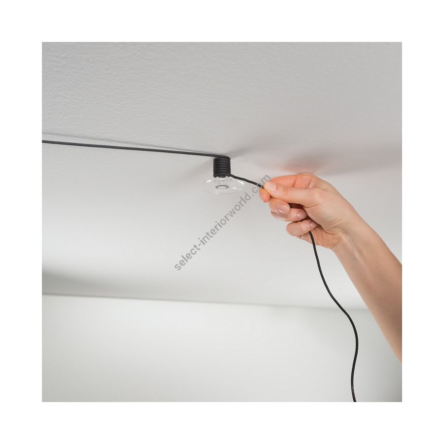 Within the collection Tripla you can find a modular system which can be installed according to the needs of the space. The metal base should be installed where the main power supply of the room is, either on the wall or on the ceiling, whereas the pendants can be moved around the room thanks to a spool that supports the wires. Often the power supply or the socket is not centered above a table or other furniture elements that need light. In all these cases, the Tripla system is a smart solution where the user can light up the room creatively and effectively.