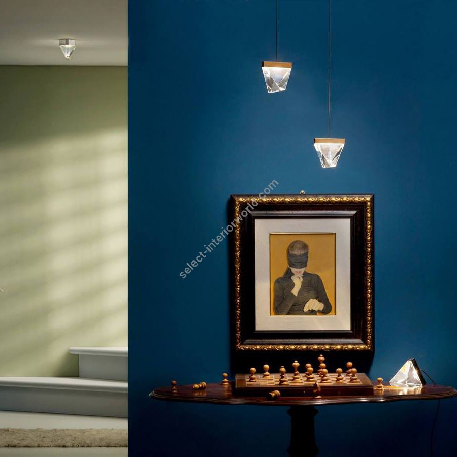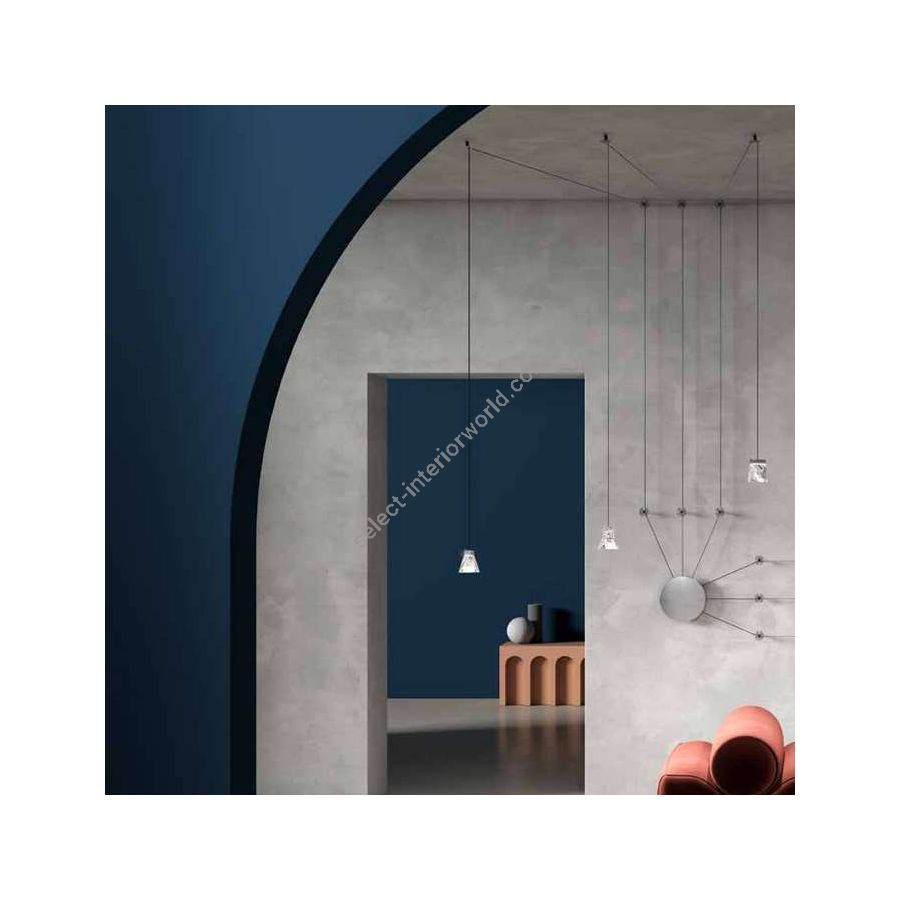 The versatile and adaptable Tripla system offers the possibility of enriching and giving uniqueness to large and domestic spaces. The lamp is completely customizable and the structure is available in three finishes: polished aluminum, anthracite and bronze. The diffuser is in crystal glass, while the canopies are in two sizes and in the three finishes indicated above. The lamp runs on mains power for LED as it includes a dimmable driver.