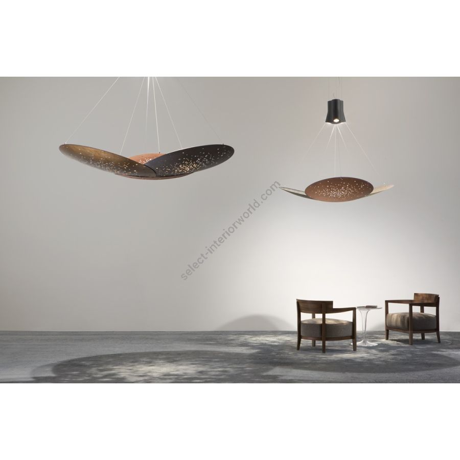 Pendant lamp with black aluminium structure and iron lens. The lens undergoes an oxidation process inducted by flame and it is followed by brushing, sponging, polishing and sanding.